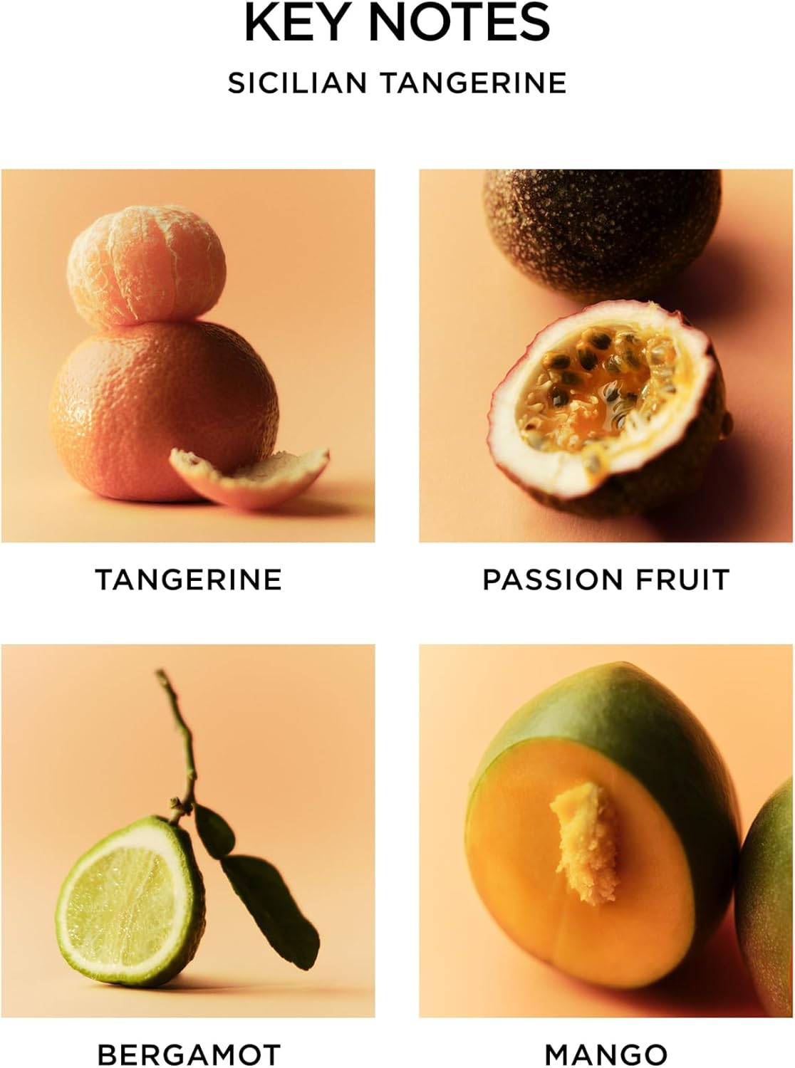 - FRESH CITRUS & FRUITS - Juicy Sicilian tangerine is blended with bergamot, exotic mango, and passionfruit for a mouthwatering aroma.