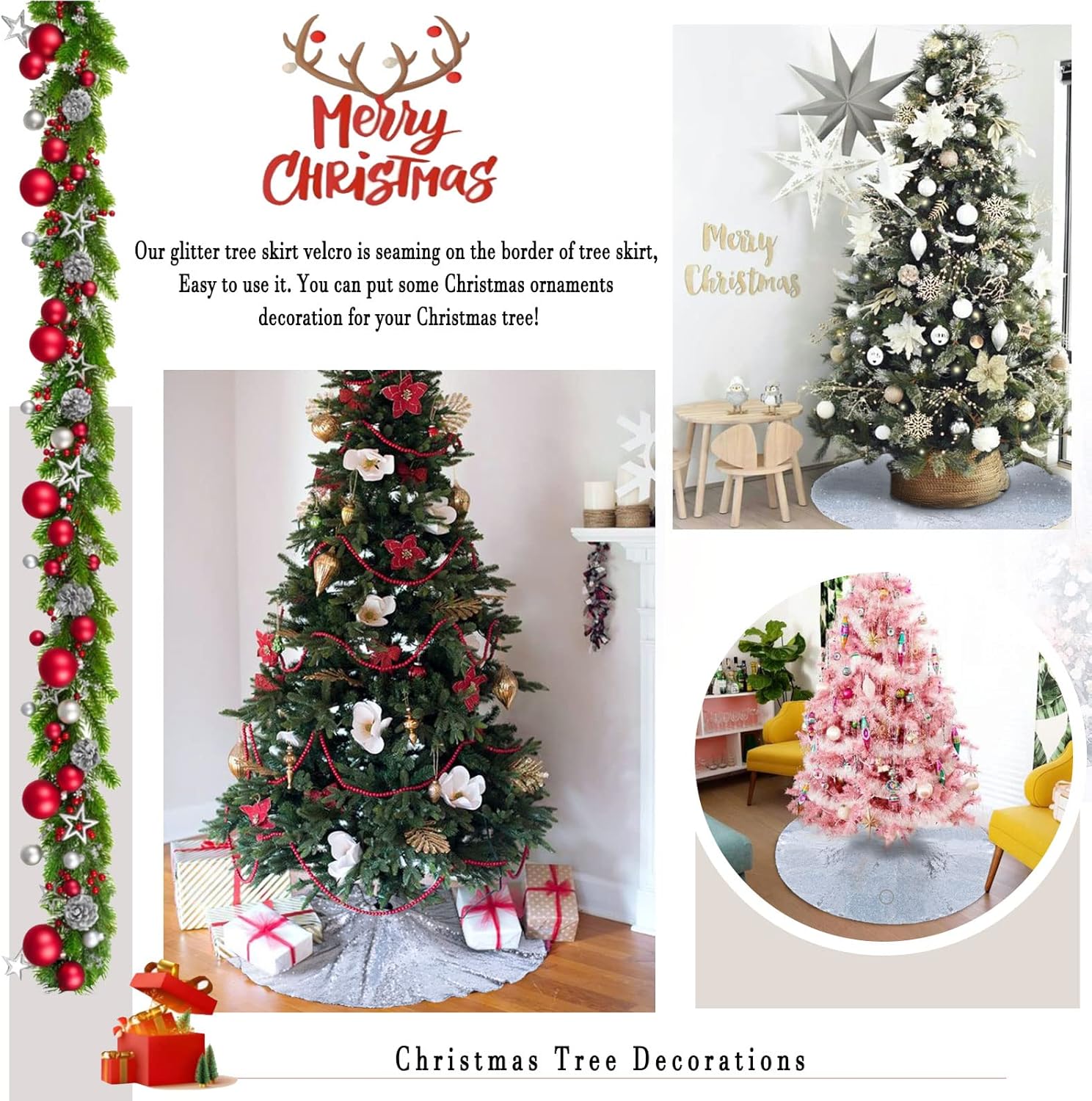 - Easy Installation: Our glitter tree skirt can be installed in seconds, and you can use them to attach a Christmas tree skirt to the base of an artificial or real Christmas tree.