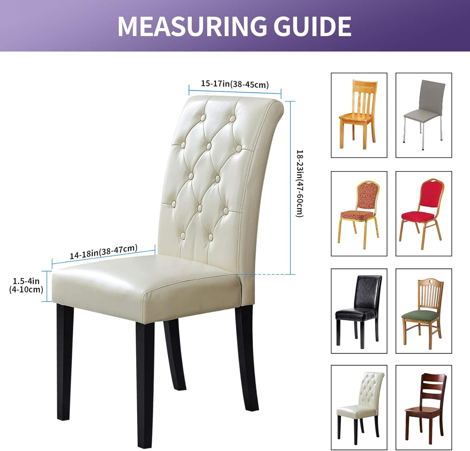 - 【PERFECT FIT】The dining chair cover fit for normal and high back parson chair.Chair-back height 18"-22'' and chair-back width 14"-19''.Chair seat width 14"-20'' and length 14"-20'' and thickness 2"-4''. More details please refer to the measurement guide in photo, please measure your chair before ordering.