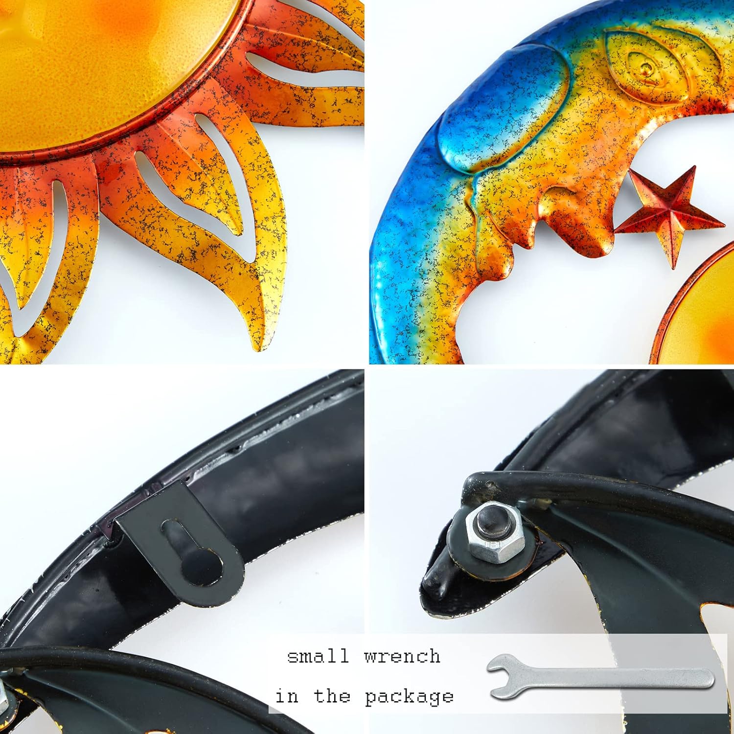 - 【size】:18 inch * 16.5 inch sun wall décor. A small wrench in the package for easy installation. Hooks on the back for easy hanging. This large size metal sun outdoor wall art decor is perfect for your indoor & outdoor space.