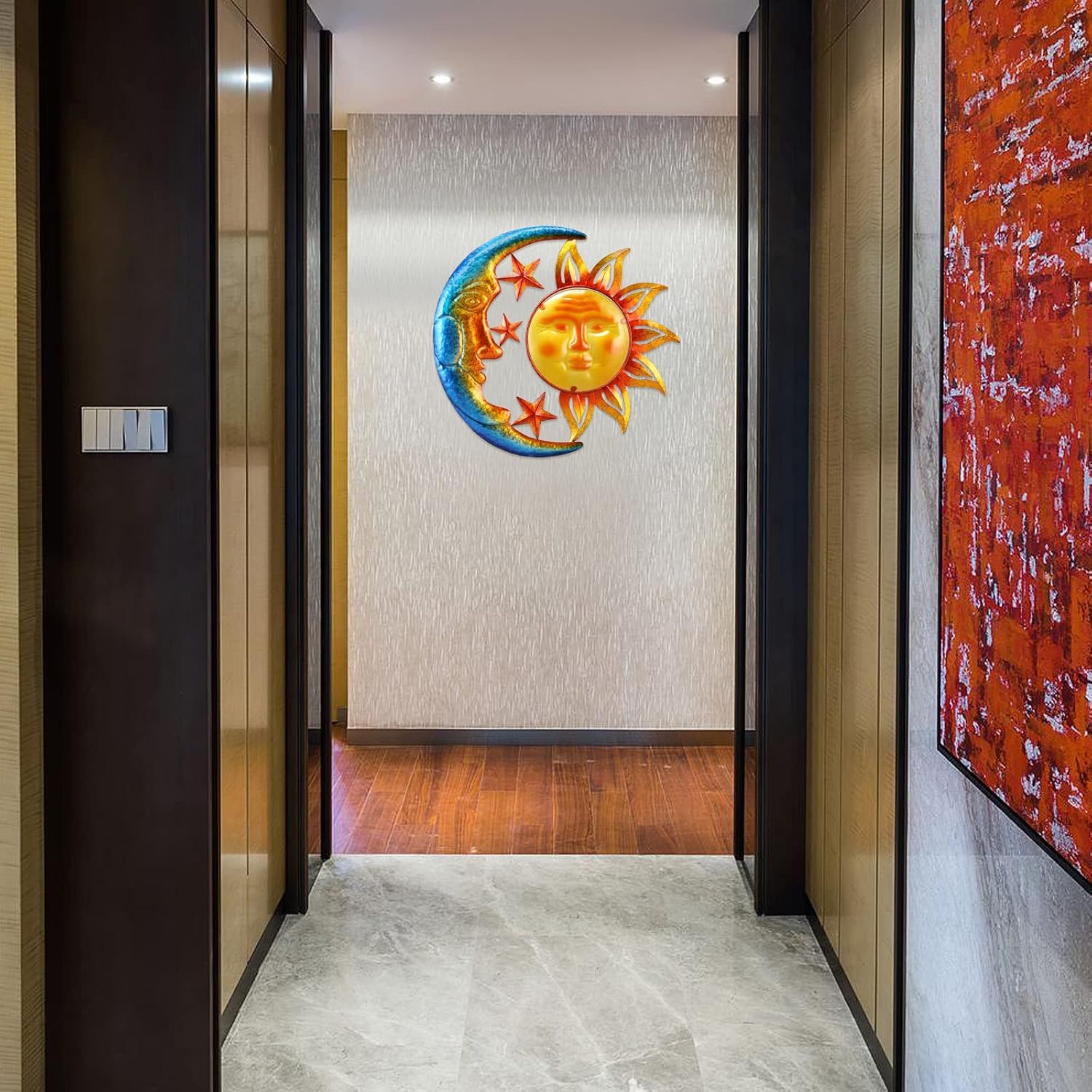 - 【Enthusiastic sun wall decor】: 18 inch* 16.5 inch large metal & glass sun wall décor. A wall décor consists of glass sun face, metal stars, metal moon & flame frame. This sun décor is a great focal point for any indoor or outdoor space.