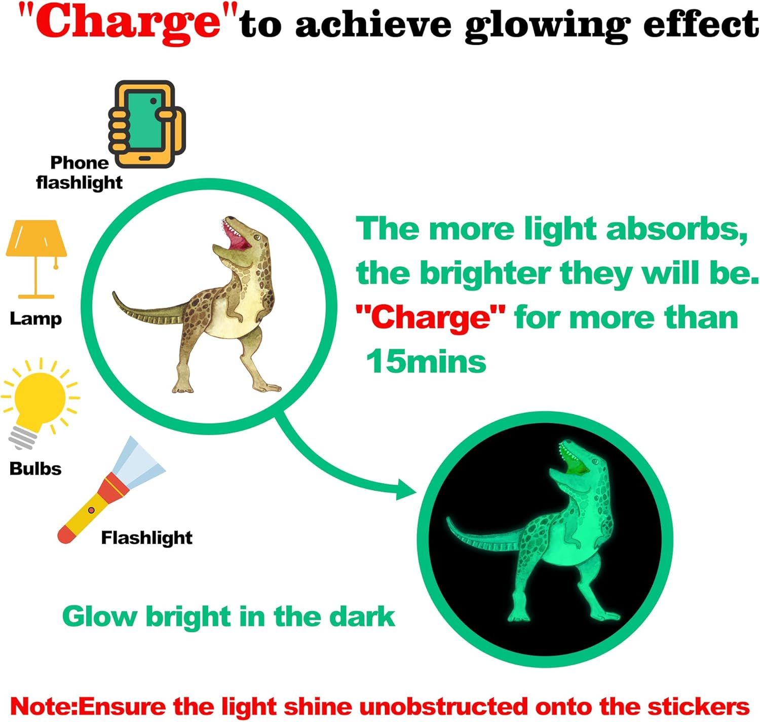 - 【Glow in the Dark Dinosaurs】:The glow dinosaur wall stickers are beautiful and glow like crazy,the brightness depends on the light it absorbs.These dinosaur wall sticker with foot decals are made of quality luminous material,they will glow brightly when absorb enough light during the day.We suggest you charge them with room light,sunlight or flashlight for 10-30 minutes.Note:(The light should shine unobstructed onto the stickers and ensure they absorb enough strong lights)