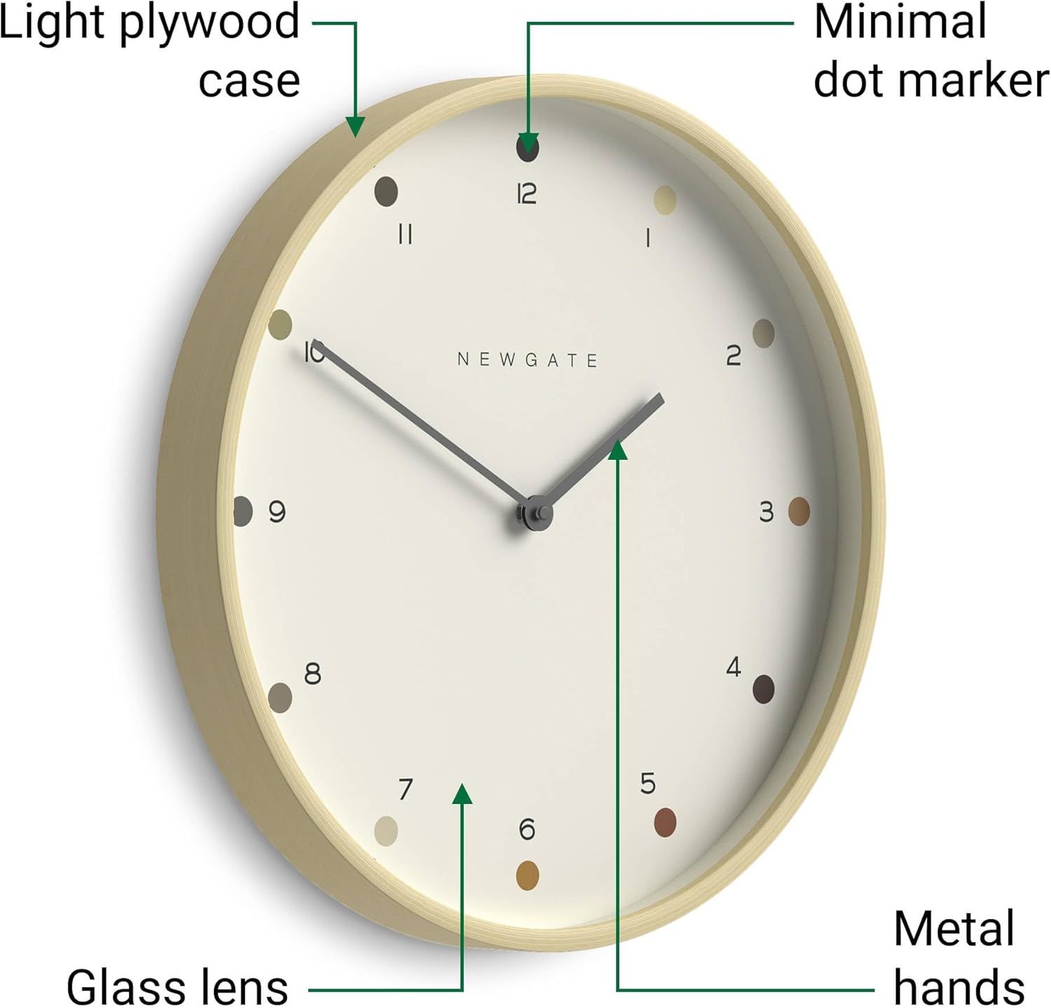 NEWGATE® Mr Clarke Wall Clock | Large Scandi Inspired Plywood Clock | 16 inch | Pale Wood case with Designer dot dial | Modern Minimalist Design for Kitchen, Living Room or Office