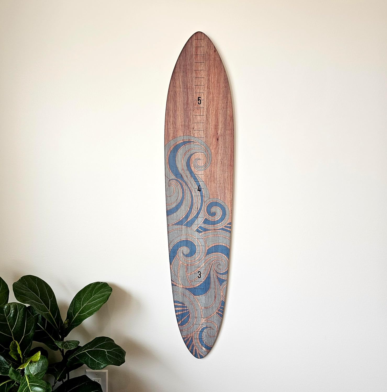 - Blue Wave, 9.5" x 45" Surfboard-inspired Growth Chart: A functional and stylish piece that blends seamlessly into nurseries, playrooms, and beach-themed spaces while serving as both decor and a way to track growth milestones.