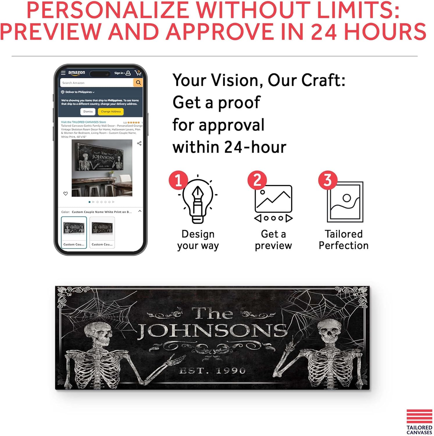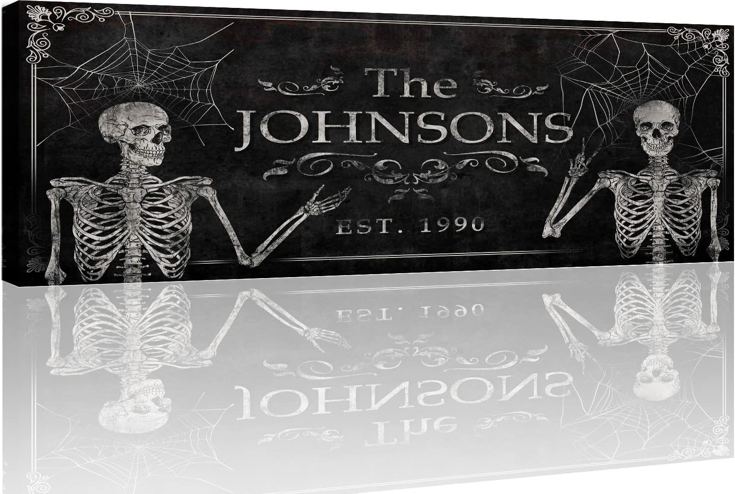Tailored Canvases Gothic Family Wall Decor - Personalized Grunge Vintage Skeleton Room Decor for Home, Halloween Lovers, Men & Women for Bedroom, Living Room - Custom Couple Name, White Print, 36"x12"