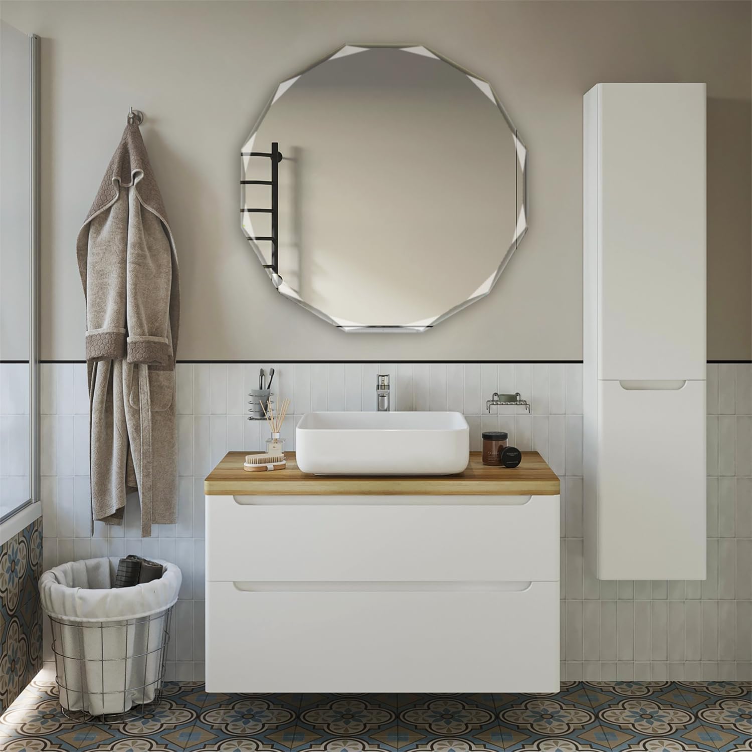 - Modern design: this simple yet elegant diamond edge is a favorite, a sleek, modern, clean, beveled edge, floating, frameless design with our solid wood backing for reinforcement and stability, avoid the warping and distortion found in cheaper brands
