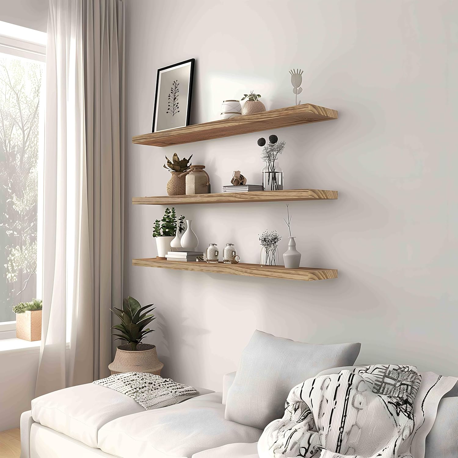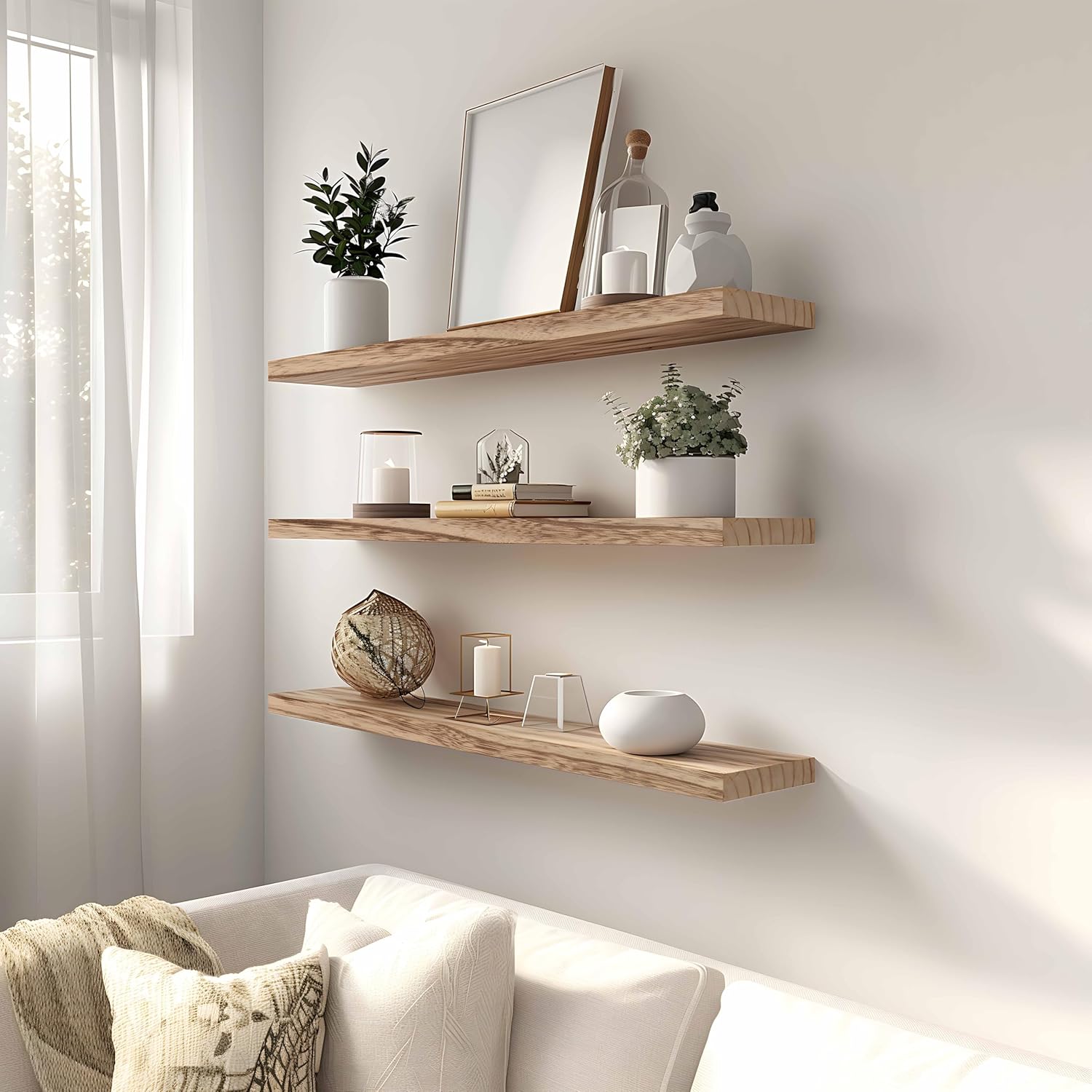 - Home decor and storage shelves - This wall shelves are the perfect piece for any rustic, modern, or natural home decor. They allow to better organize spaces, helping you conveniently store everything from alarm clocks, books, pictures to potted plants.