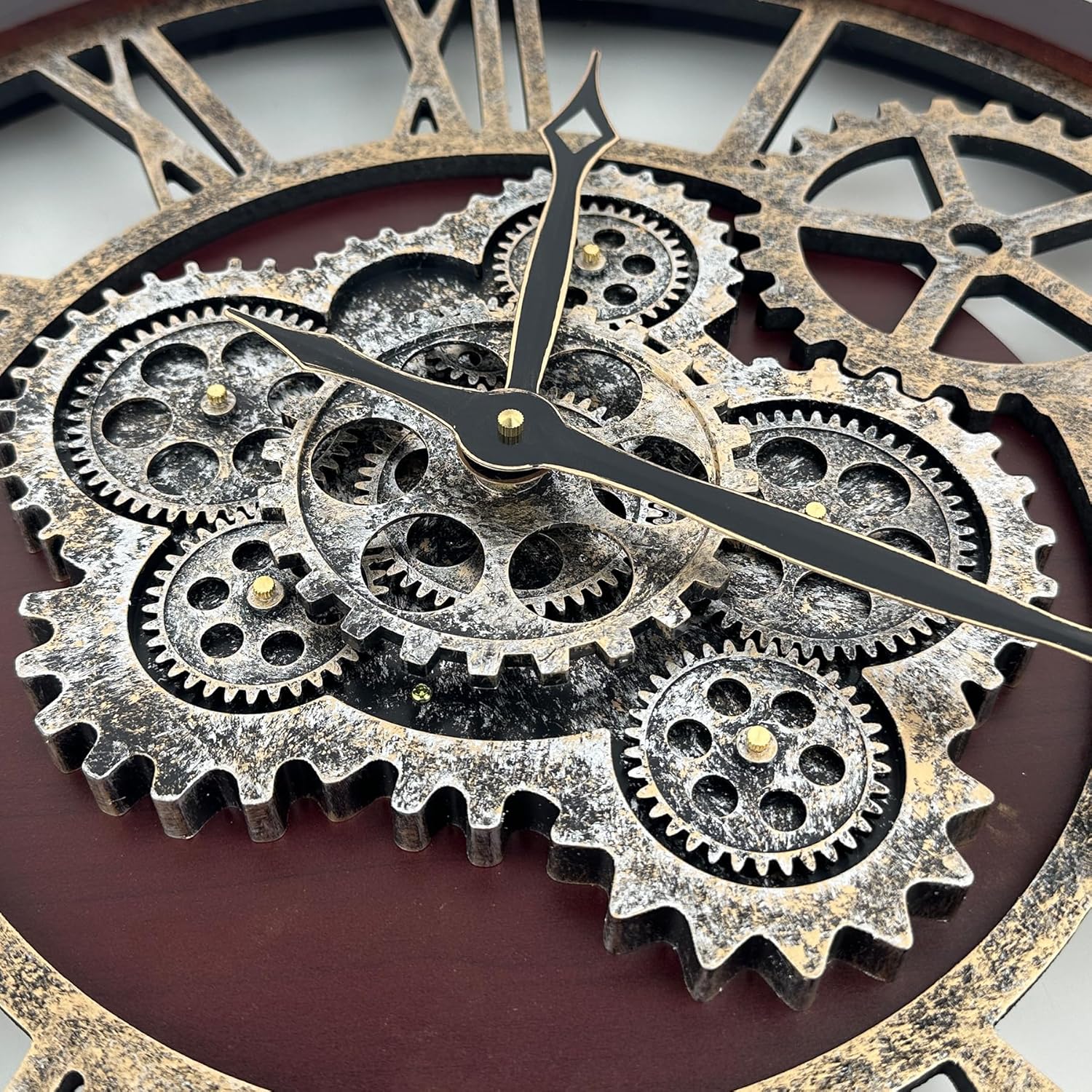 - 【Real Moving Gear Clock】All gears for the wall clock are real moving! Design with rustic bronze-color and industrial style. An creative combination of four gears for a retro look, has a very exquisite decorative effect makes the wall clock become a chic art works. The large wall clock crafted of nature wood & MDF. Big roman numeral numbers and wood rustic moving gears perfect for any room decor.