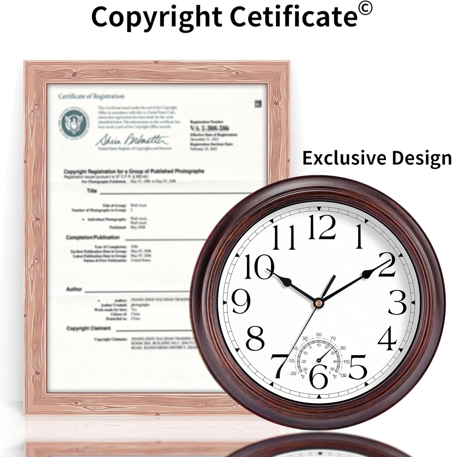 12 Inch Outdoor Wall Clock with Thermometers, Vintage Silent Wall Clocks Battery Operated, Retro Non-Ticking Clock Decorative for Living Room, Patio, Kitchen, Office, Bathroom, Bedroom(Bronze)