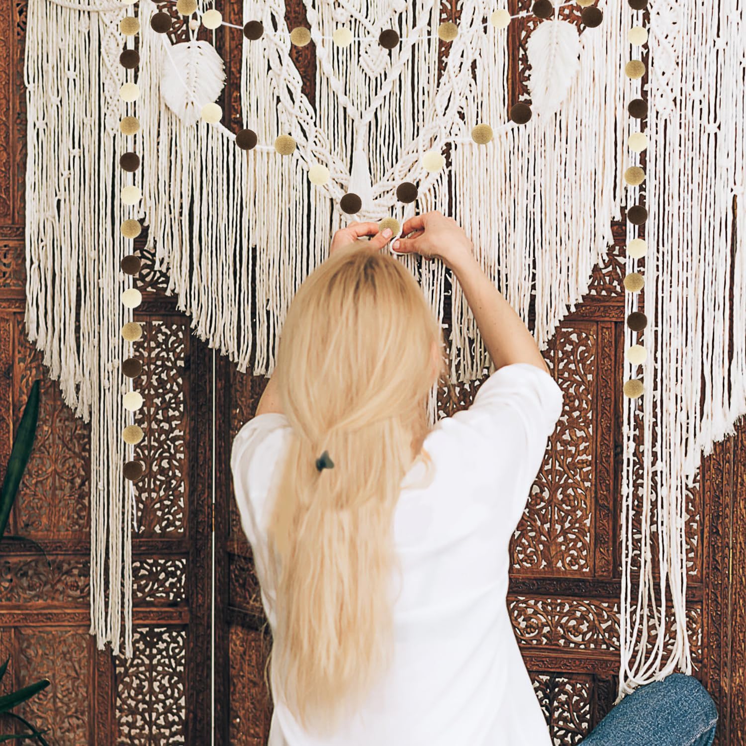 - POLYSTYRENE PREMIUM QUALITY: Our felt pom pom balls are made of high-quality polystyrene fiber and string together with white neutral chunky cotton yarn cord rope, polystyrene is an eco-friendly material, the mini felted balls has bohemian Boho Brown Khaki and Beige multi-color, solid and beautiful, fluffy and lightweight, bright and colorful, soft and comfortable, durable and reusable, so our sweet polystyrene felted pompom balls are more better than wool felt balls.
