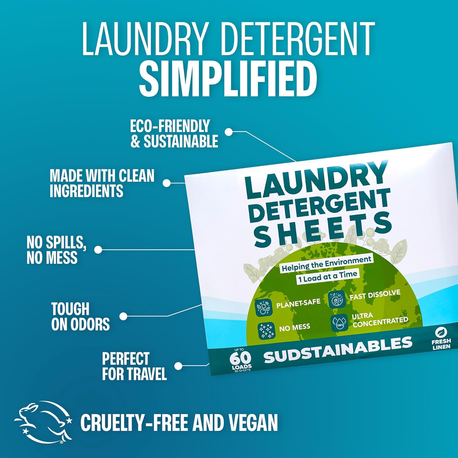Sudstainables Laundry Detergent Sheets (60 Loads) – Eco-Friendly, Zero Waste, Plastic-Free Laundry Washing Machines Soap Sheets; Dissolvable, Space-Saving Strips for Travel (Fresh Linen)