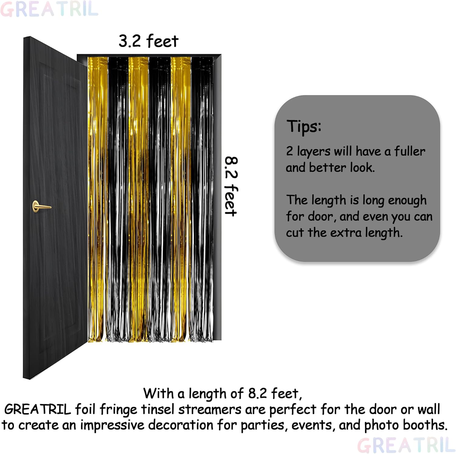 - Each streamer measures 3.2ft x 8.2ft, and with 2 packs included, you'll have enough to effortlessly decorate party walls or doors, providing a luxurious and stunning backdrop for your celebration.