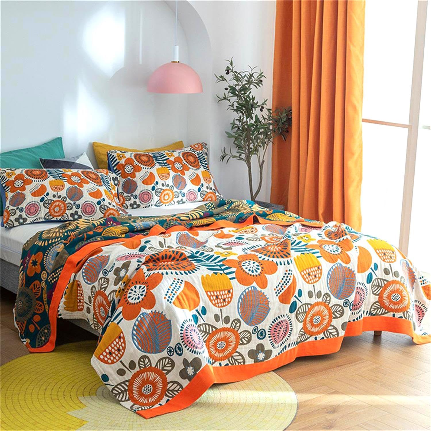 Cotton Throw Blanket for Couch Bed 100% Cotton Quilt 90''x 98'', Boho Floral Blanket Cozy Soft Muslin Farmhouse Bed Blanket Decorative Christmas Blankets Gifts for Women Mom