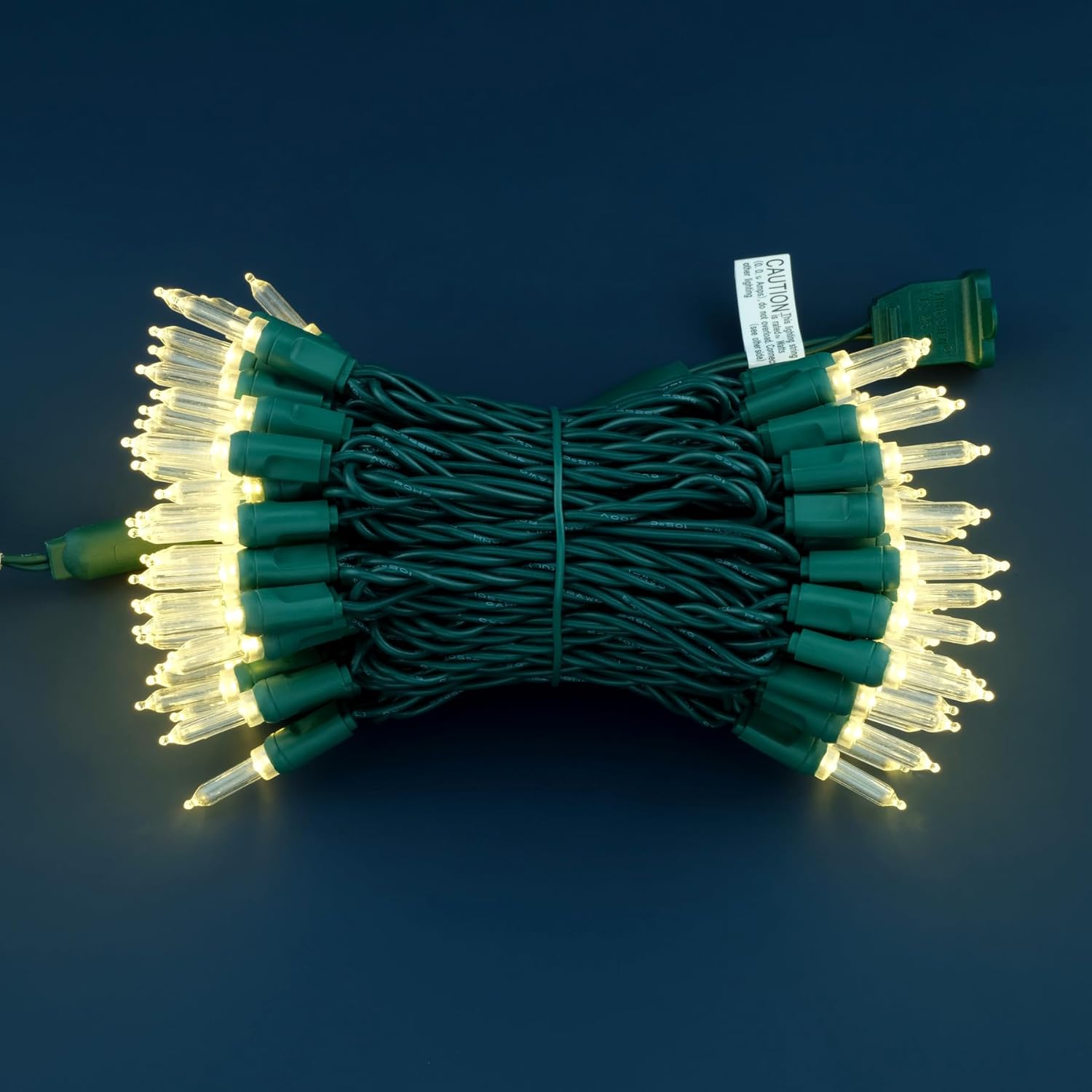 - SPECIFICATIONS ☀ Each pack contains 1 strands of one-piece string lights, total length 33 feet with 100 count warm white mini lights. 22 AWG green cord, 4" lead, 4" spacing, 4" tail.