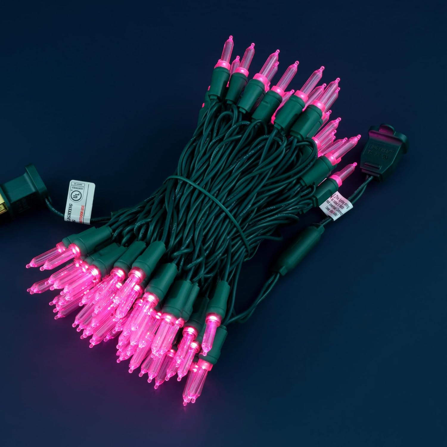 - SPECIFICATIONS ☀ Each pack contains 1 strands of one-piece string lights, total length 33 feet with 100 count pink mini lights. 22 AWG green cord, 4" lead, 4" spacing, 4" tail.