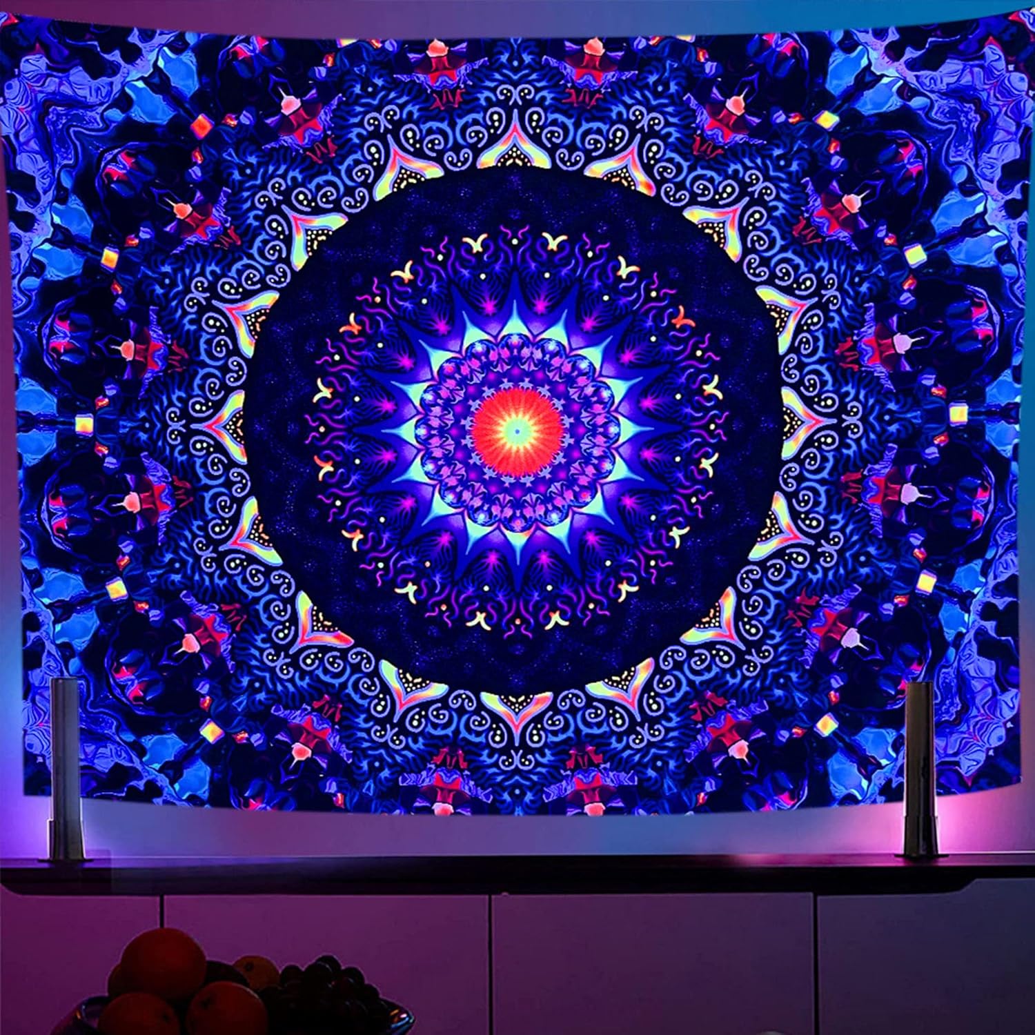 - Blacklight/UV Reactive: Infuse vitality and radiance into any room with our blacklight tapestry. Crafted using special inks, this tapestry can glow gorgeously under blacklight or UV light in the dark. Ideal for parties, celebrations, and occasions that demand an atmosphere of fun and uniqueness.