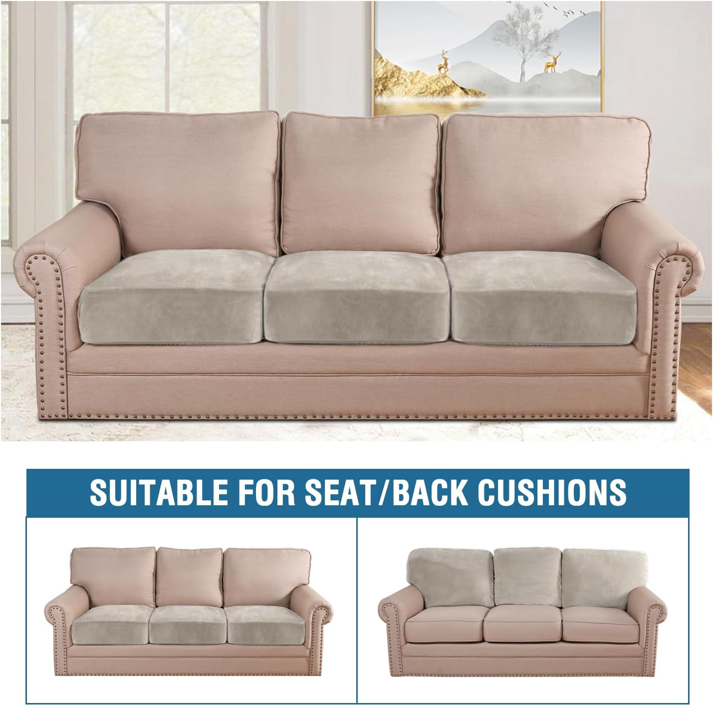 H.VERSAILTEX Velvet Stretch Couch Cushion Cover Plush Cushion Slipcover for Chair Loveseat Sofa Cushion Furniture Protector Seat Cushion Sofa Cover (3 Piece Sofa Cushion Covers, Oatmeal)