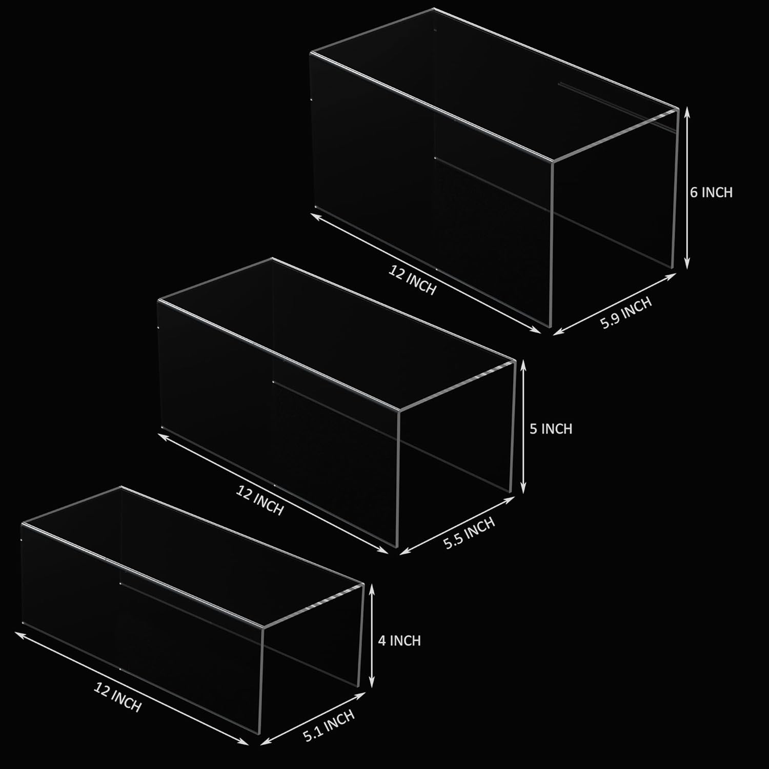 Clear Display Risers Shelf 3pcs, Countertop Rectangular Acrylic Display Storage Organizer, Acrylic Stands for Funko Pop Figure, Cosmetics, Bags, Shoes, Toys, Collectibles - 12- 4'', 5'', 6''