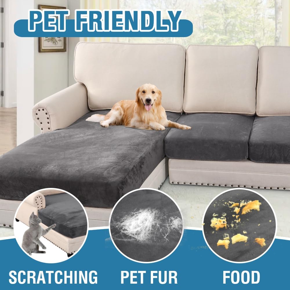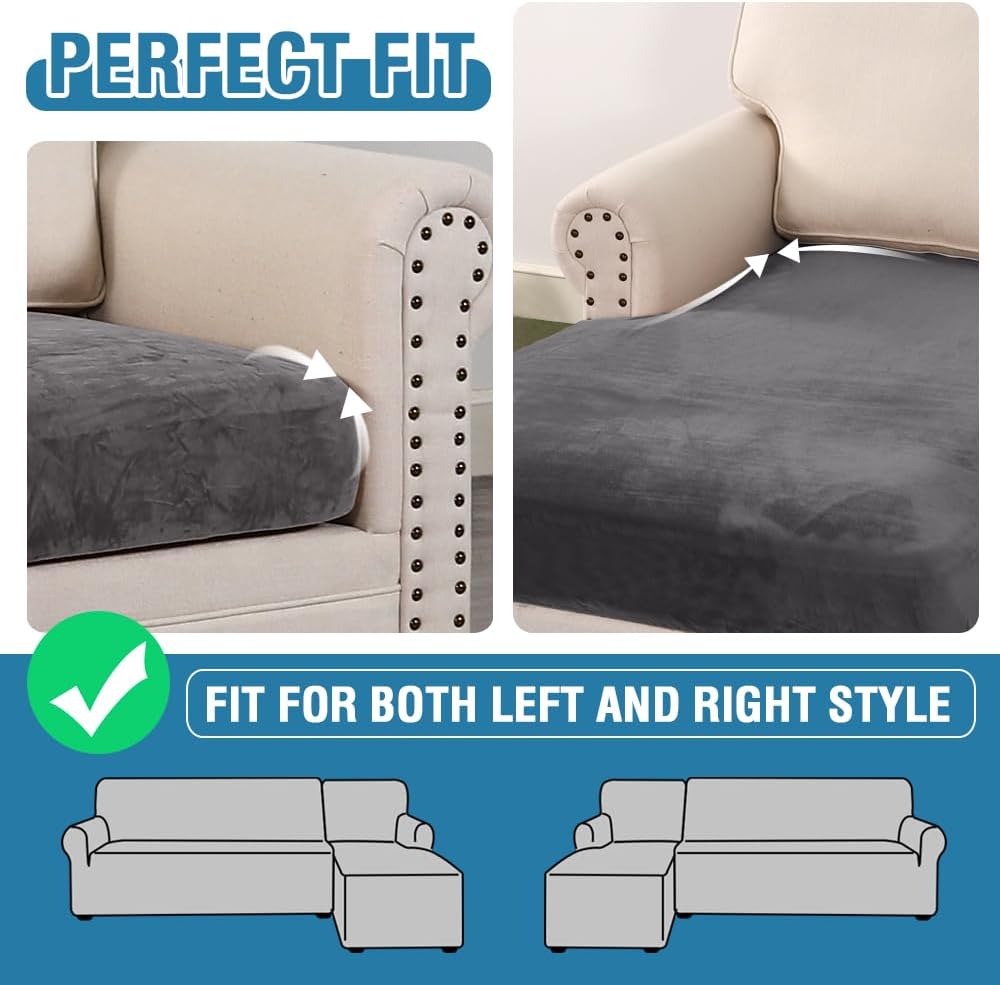 - INCREDIBLY COMFORTABLE VELVET: Products passed GLOBAL RECYCLED STANDARD certificate.This innovated stretch sofa slipcovers are constructed with 4 PIECES,including 1 Chaise cover and 3 individual cushion covers. Crafted from luxurious velvet plush fabric, feature thick, soft, smooth, anti-wrinkle, no fading, durable as well as highly stretch. Protect your cushion furniture from daily wears and tears, stains, kids, scratches from pet claws, dogs or accidental spills