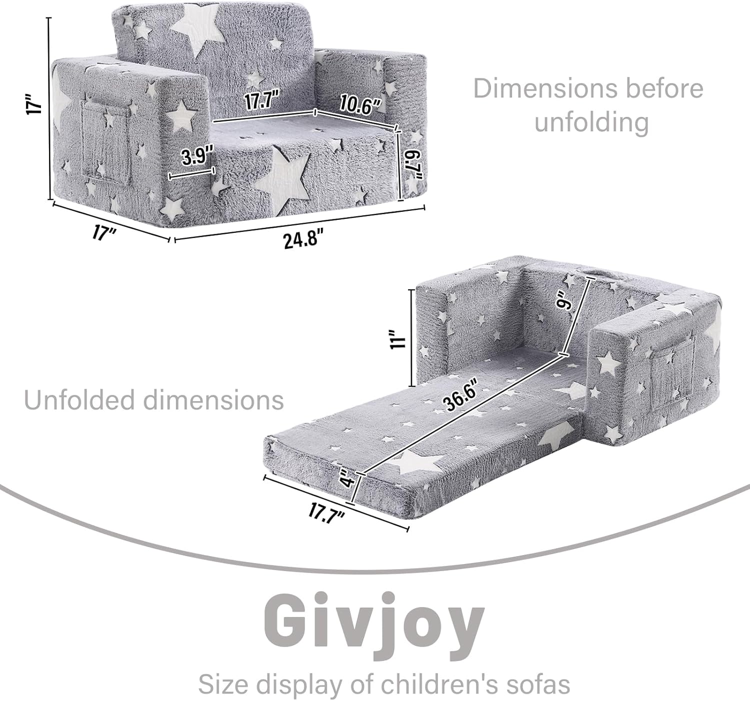 Toddler Chair Plush Kids Couch, 2-in-1 Comfy Armchair Removable and Washable Cover Carrying Handle, Convertible Reading Chair Toddler Couch for Girls and Boys, Glow in The Dark Grey Star