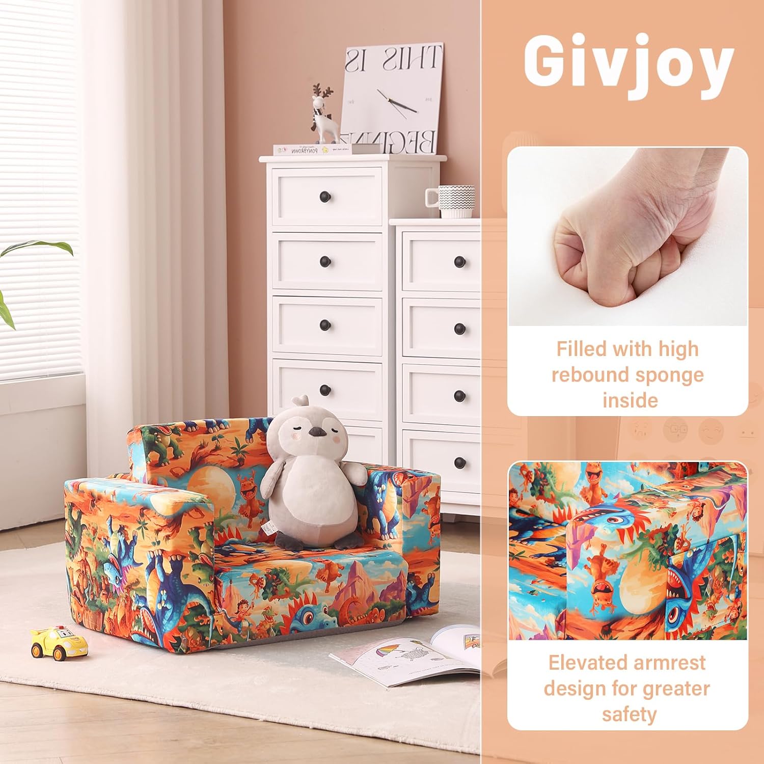 - 【Safe & Skin-friendly Material】The cover of 2-in-1 kids sofa couch is made of high quality short plush which is durable and skin-friendly. High density and hardness of the supportive foam keep the sturdy toddler sofa couch in shape and provide our lovely kids all-day comfort. Its premium quality also ensures immediate expansion without needing a long wait.