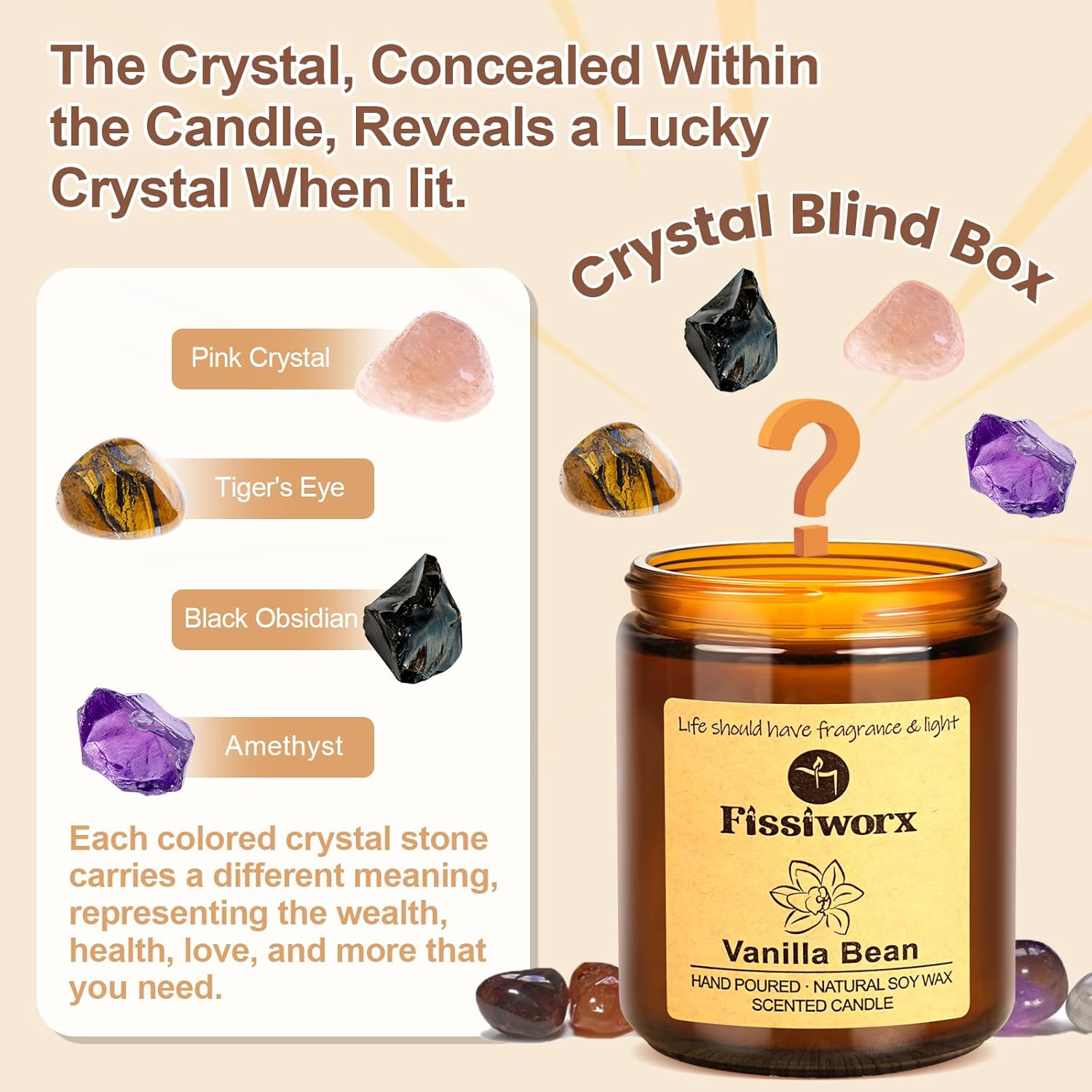 - 🌳Natural Soy Wax With Lucky Stone - Enjoy up to 60 hours of continuous burn time , proudly made with 100% natural soy wax that burns evenly. Our fragrances are paraben-free, phthalate-free, and never tested on animals. Fissiworx scents gently enhance spaces rather than overpower them, ideal for those sensitive to scents.(Our soy wax candles contain a random lucky stone that can bring good fortune to everyone. Additionally, it will not burn nor pose any danger).