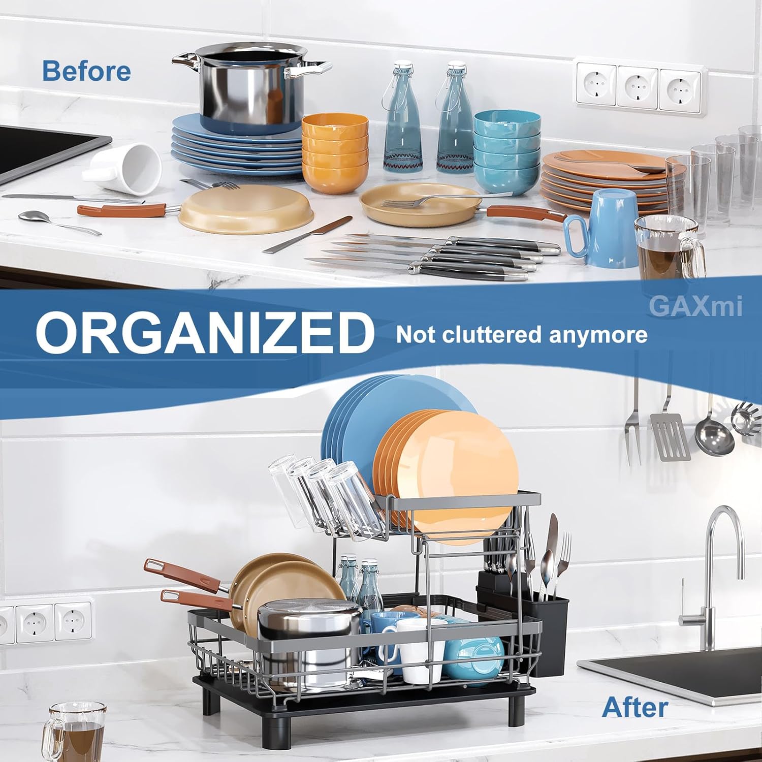 - Space-Saving: this dish drying rack is able to organize one meal tableware. Your kitchen countertop will not be scattered anymore.