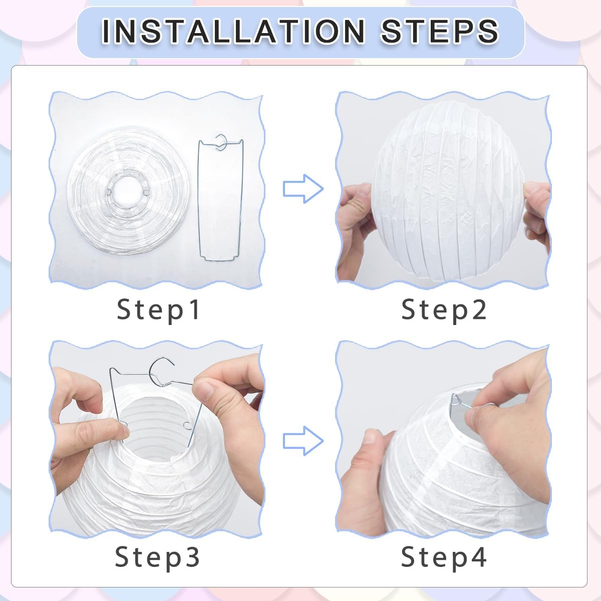 - 【Easy to assemble】: Our lanterns are easy to unfold, assemble and hang up, and they can be folded flat for storage. All you need to do is to pull the two ends gently to open the lantern and insert the metal frame (included in the pack) into the lantern to keep its shape.