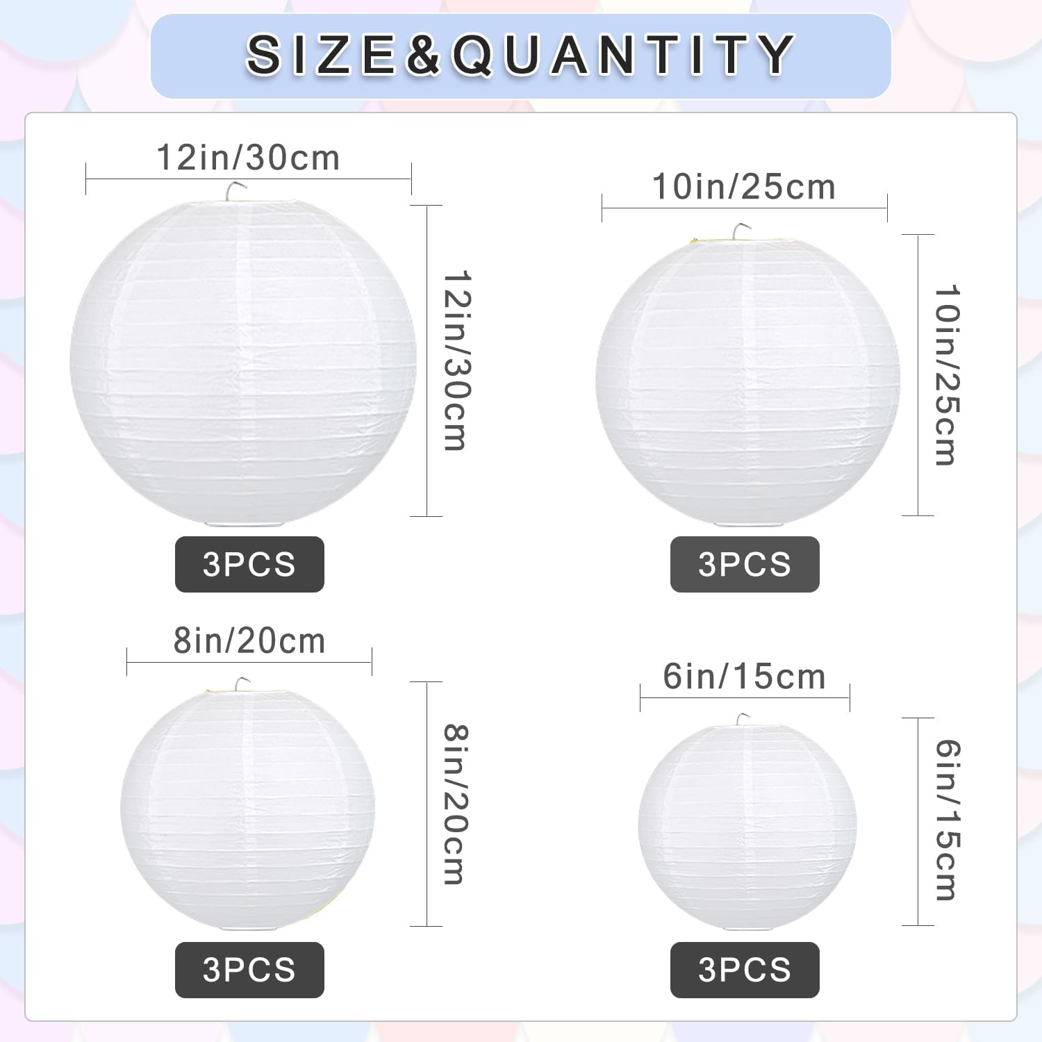 - 【Package】: You will receive 12 pieces of basic paper lanterns. (Size: 6inch * 3pcs). (Size: 8inch * 3pcs). (Size: 10inch * 3pcs). (Size: 12inch * 3pcs).