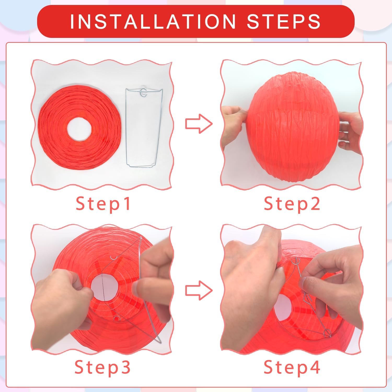 - 【Easy to assemble】: Our lanterns are easy to unfold, assemble and hang up, and they can be folded flat for storage. All you need to do is to pull the two ends gently to open the lantern and insert the metal frame (included in the pack) into the lantern to keep its shape.