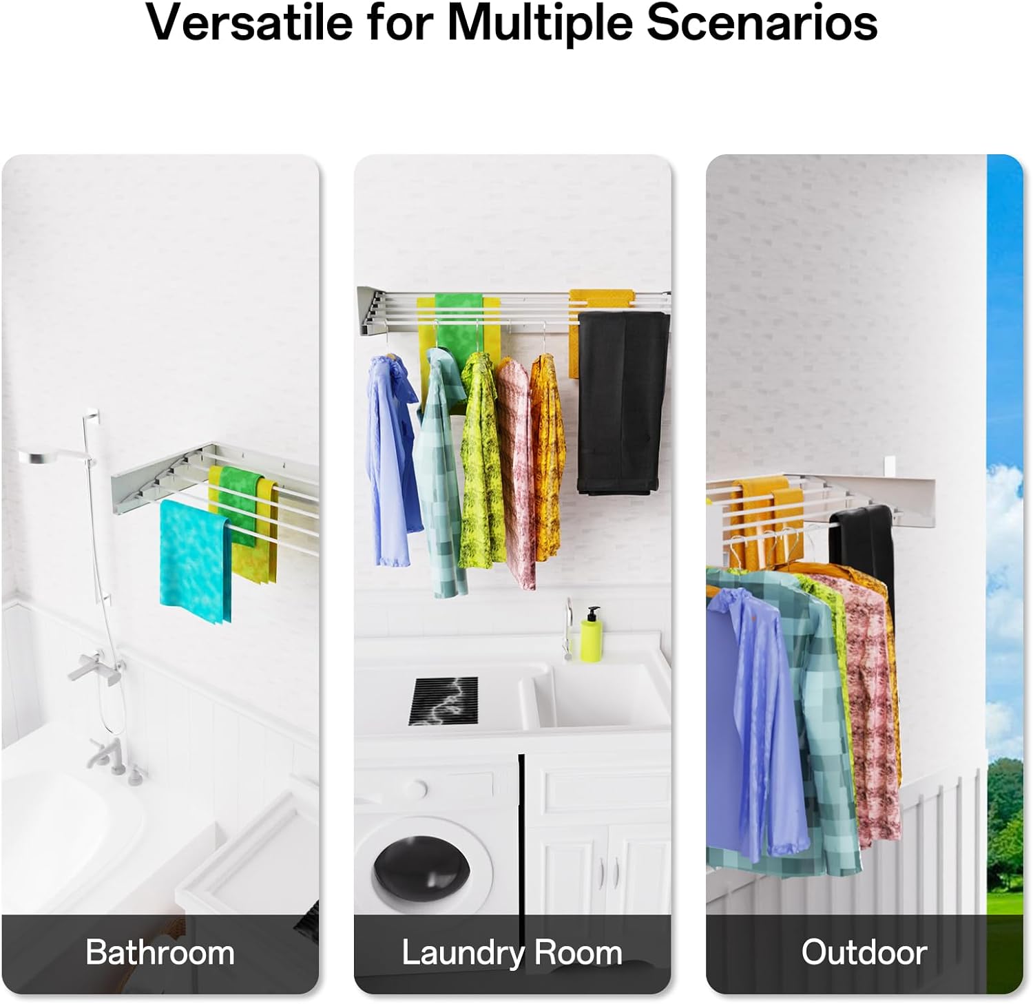- 【Widely Used Scenarios】Multifunctional clothing drying racks are suitable for indoor or outdoor use. Used for drying towels, socks, shirts, sweaters, sports underwear, hats, coats, suits, dresses, shoes, etc. This practical wall mounted clothes rack is perfect for your balcony, terrace, and laundry, making your family more comfortable and beautiful.