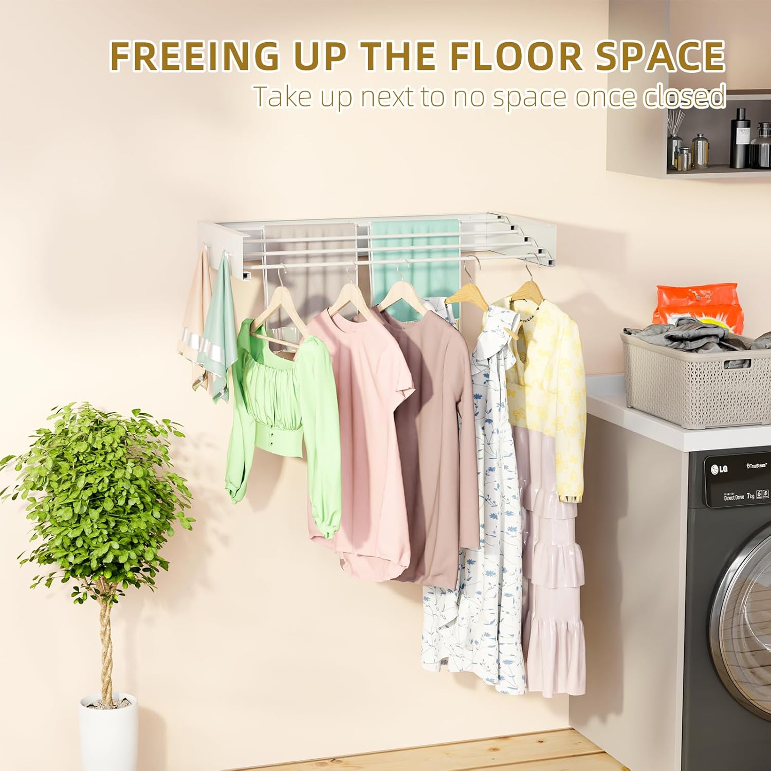 - Upgrade Drying Racks & Space Saver: 4 convenient Knob Hooks attached on wall mounted drying racks make it easy to retract, allowing you to hang clothes, towels, ties or extra stuff even when folded. Upgrade smoothness and quietness when retracting and opening. Upgrade the stability of poles, so the rods on it never spin with wet laundry loaded. laundry drying rack folds flat against the wall, really save space when not in use.