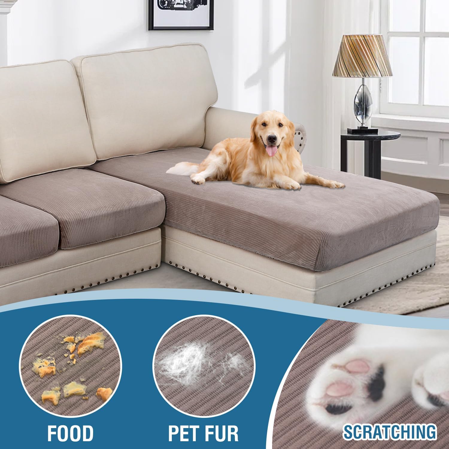 - INCREDIBLY COMFORTABLE VELVET: Products passed GLOBAL RECYCLED STANDARD certificate.This innovated stretch sofa slipcovers are constructed with 4 PIECES,including 1 Chaise cover and 3 individual cushion covers. Crafted from luxurious velvet plush fabric with unique striped cuts, feature thick, soft, smooth, anti-wrinkle, no fading, durable as well as highly stretch. Protect your cushion furniture from daily wears and tears, stains, kids, scratches from pet claws, dogs or accidental spills