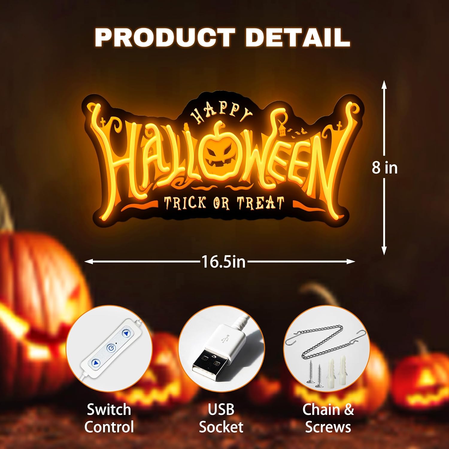 - Happy Halloween Neon Sign: This Halloween neon light is 42 x 21 cm/16.5 x 8 inch. If you want to find eye-catching decorations for Halloween, don't miss out on this Happy Halloween Neon Sign. It is composed of the letters "Happy Halloween" and "Trick or Treat," and is made using UV printing and LED neon light technology, giving the neon sign a unique design and vibrant color combination. When lit up, it creates a charming atmosphere in your space.