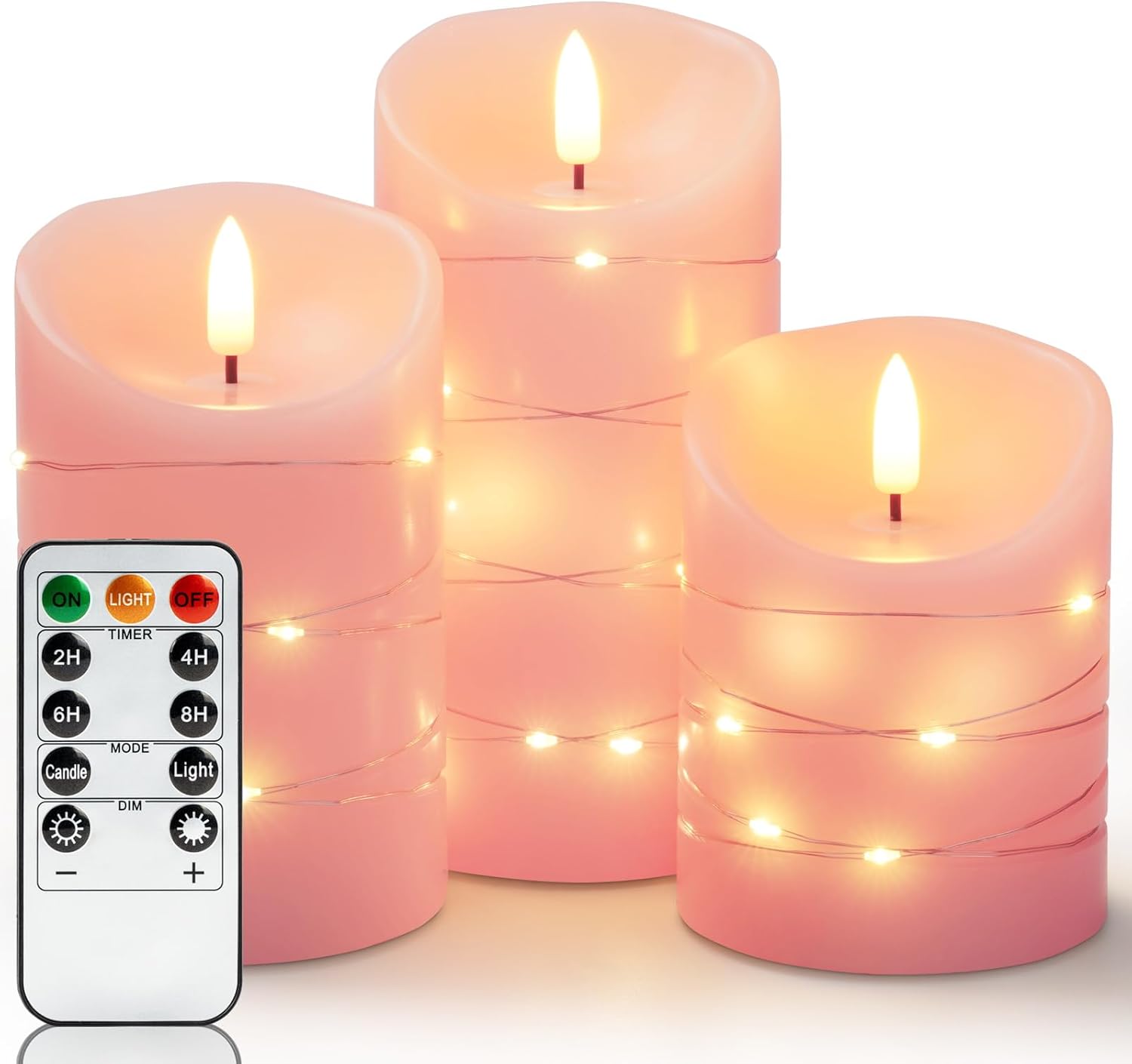 Homemory Flameless Candles with String Lights, 3 Pack Embedded Fairy String Lights LED Candles, Electric Flickering Candles with Remote Control and Timer, Real Wax, Pink