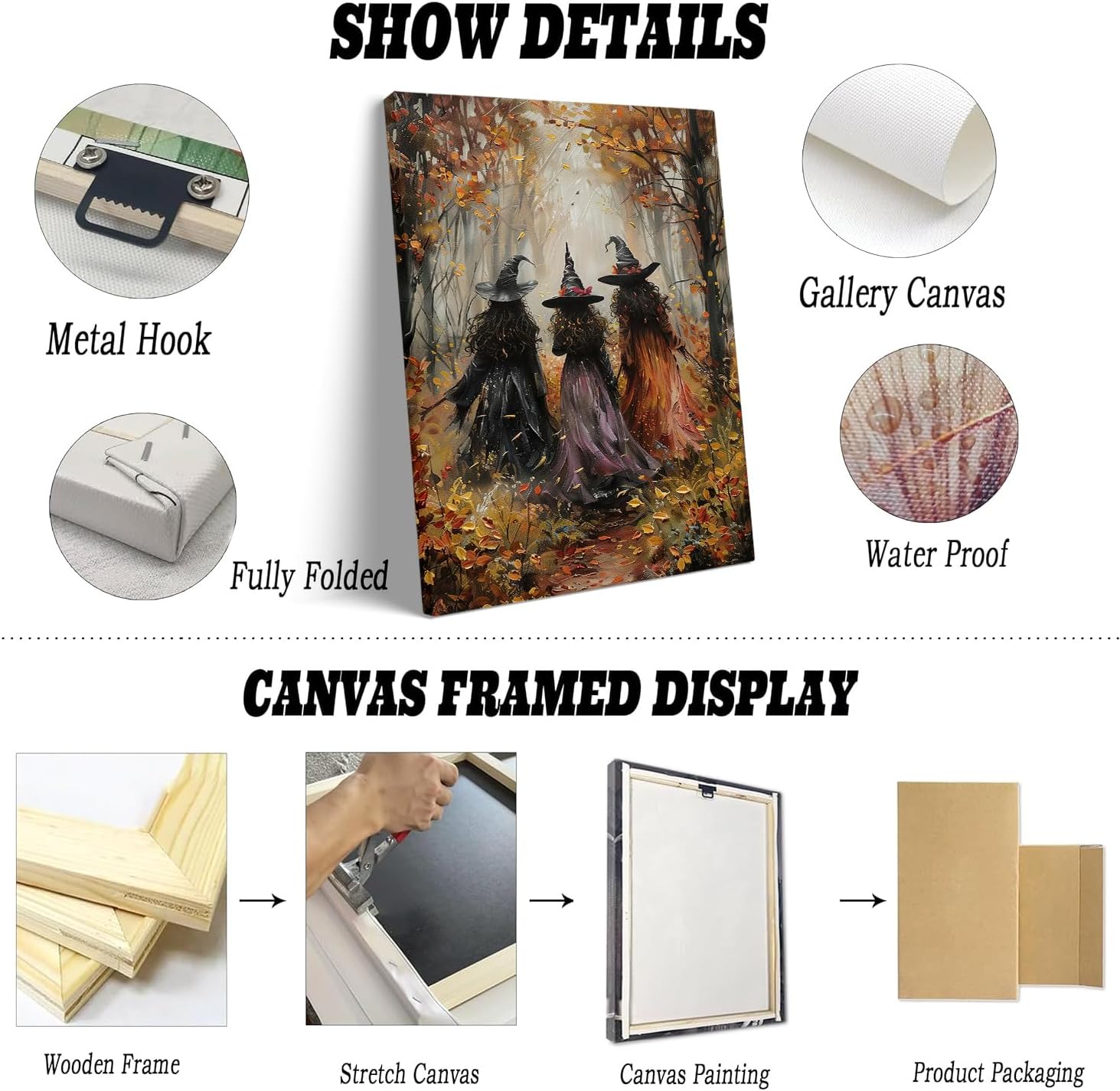 - Easy To Hang:Retro Halloween Print Frame wall art Poster size:24*36inchs. Whimsical ghost art already stretched on solid wooden frames, gallery wrapped, with hooks and accessories, ready to hang. The painting can be easily hung in any room you like and is very convenient. This unique print captures the essence of classicwitchcraft and Gothic,adding an eerie touch to any space.