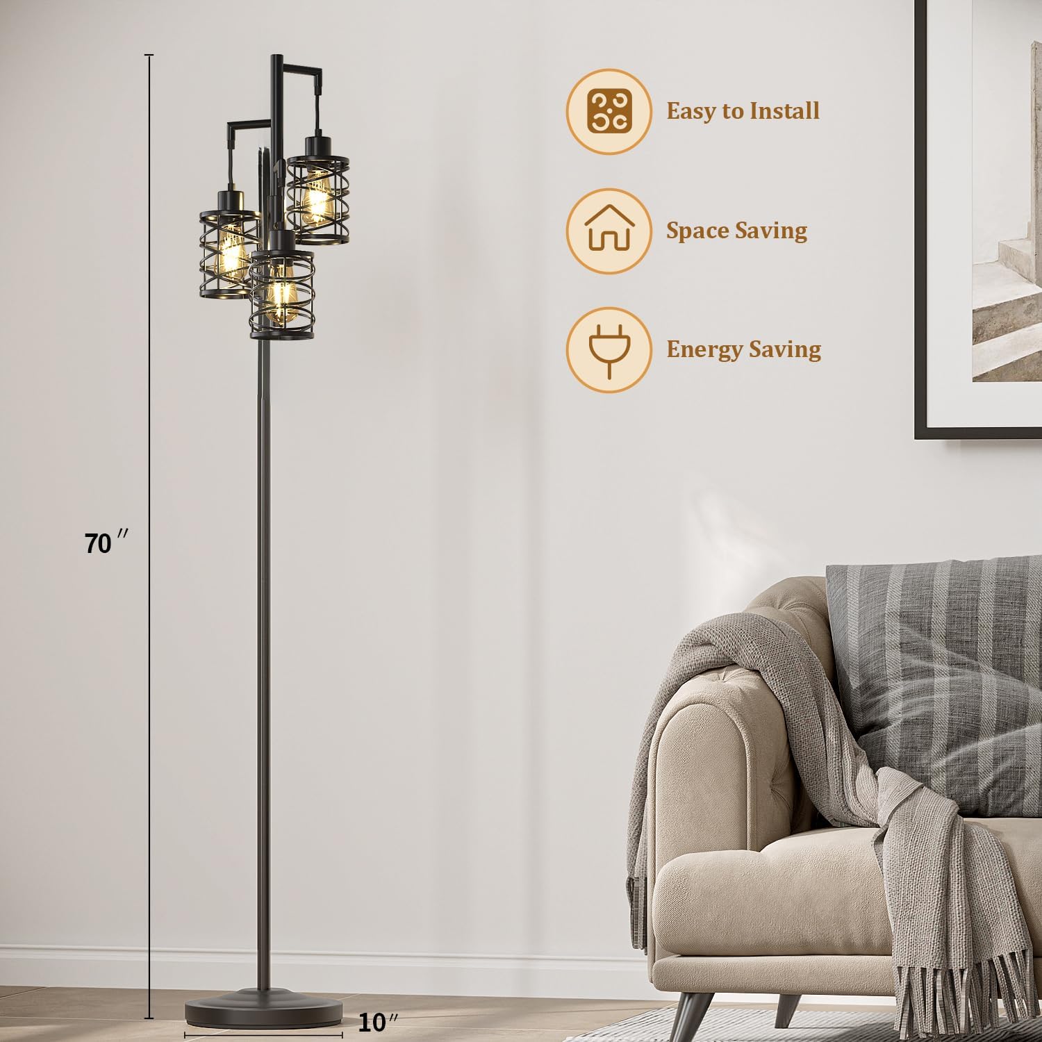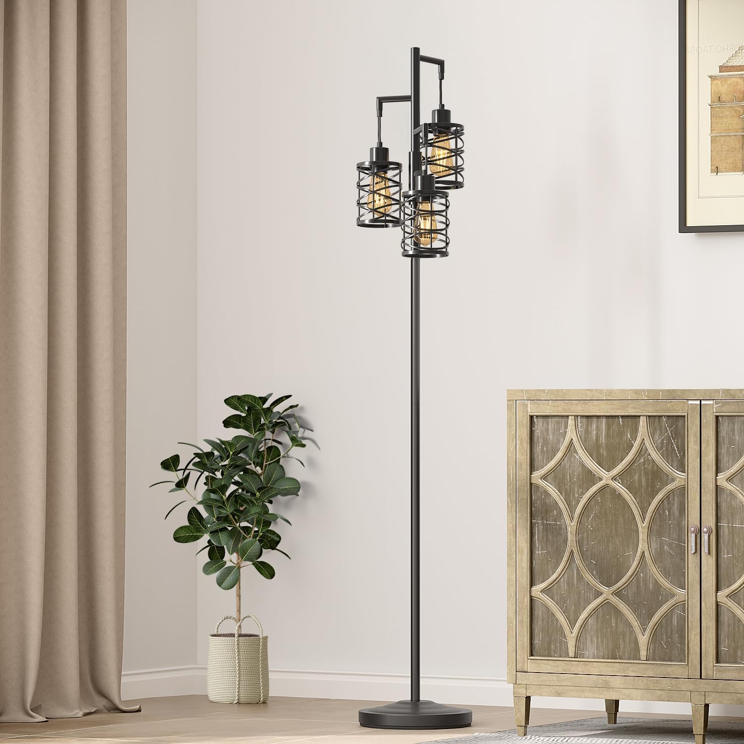 - Exquisite and Unique Design Industrial Floor Lamp: Whether you're looking to enhance your home decor or add some functional lighting solutions to your space, this tall floor lamp is sure to meet your individual needs. Equipped with three exquisite cage shades, it perfectly combines decorative style with lighting practicality. Suitable for living room, bedroom, study, office, dining room and more other scenes