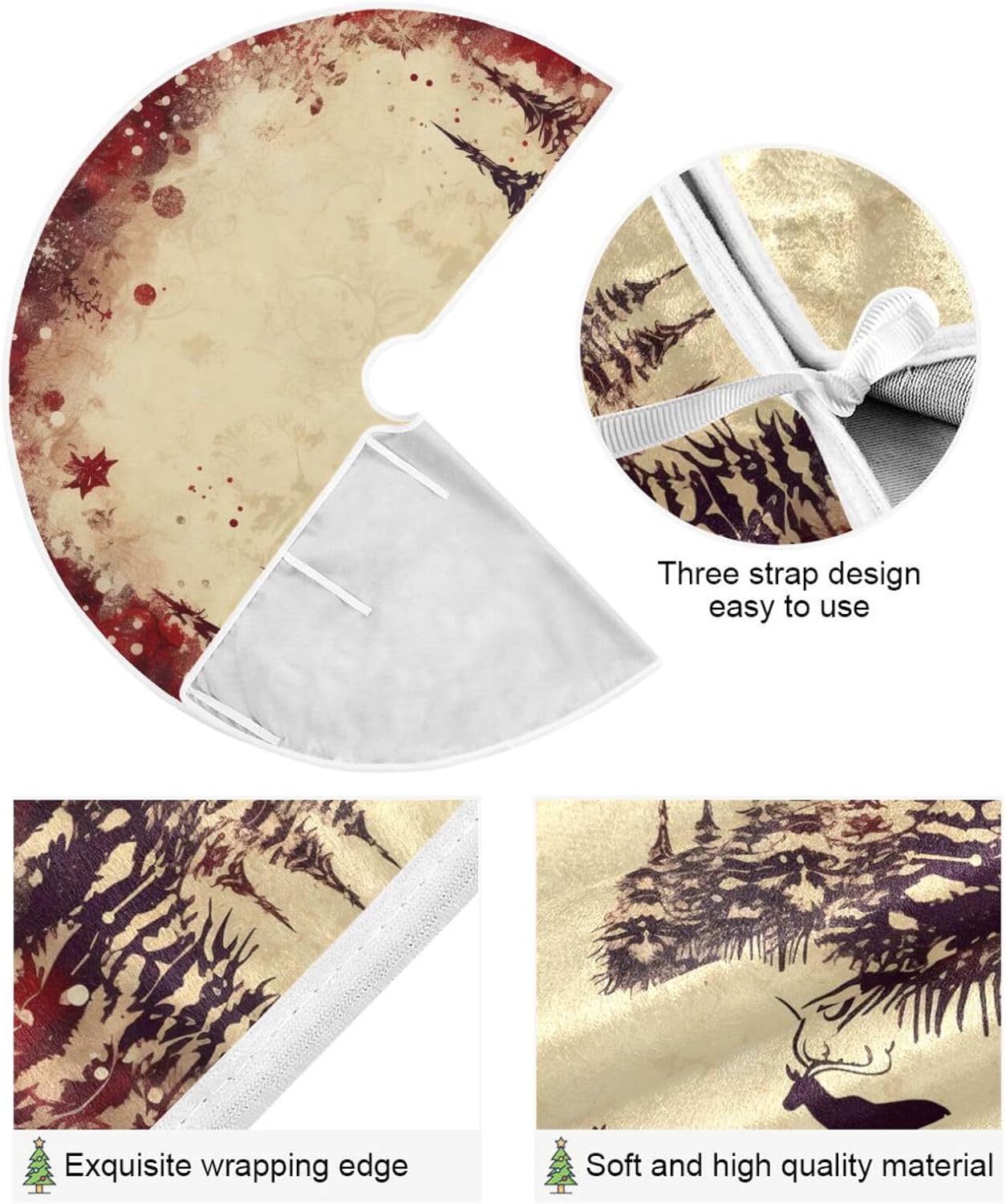 Vintage Red Elk Christmas Tree Skirt - 48 Inch Xmas Tree Mat for New Year Party Decorations
