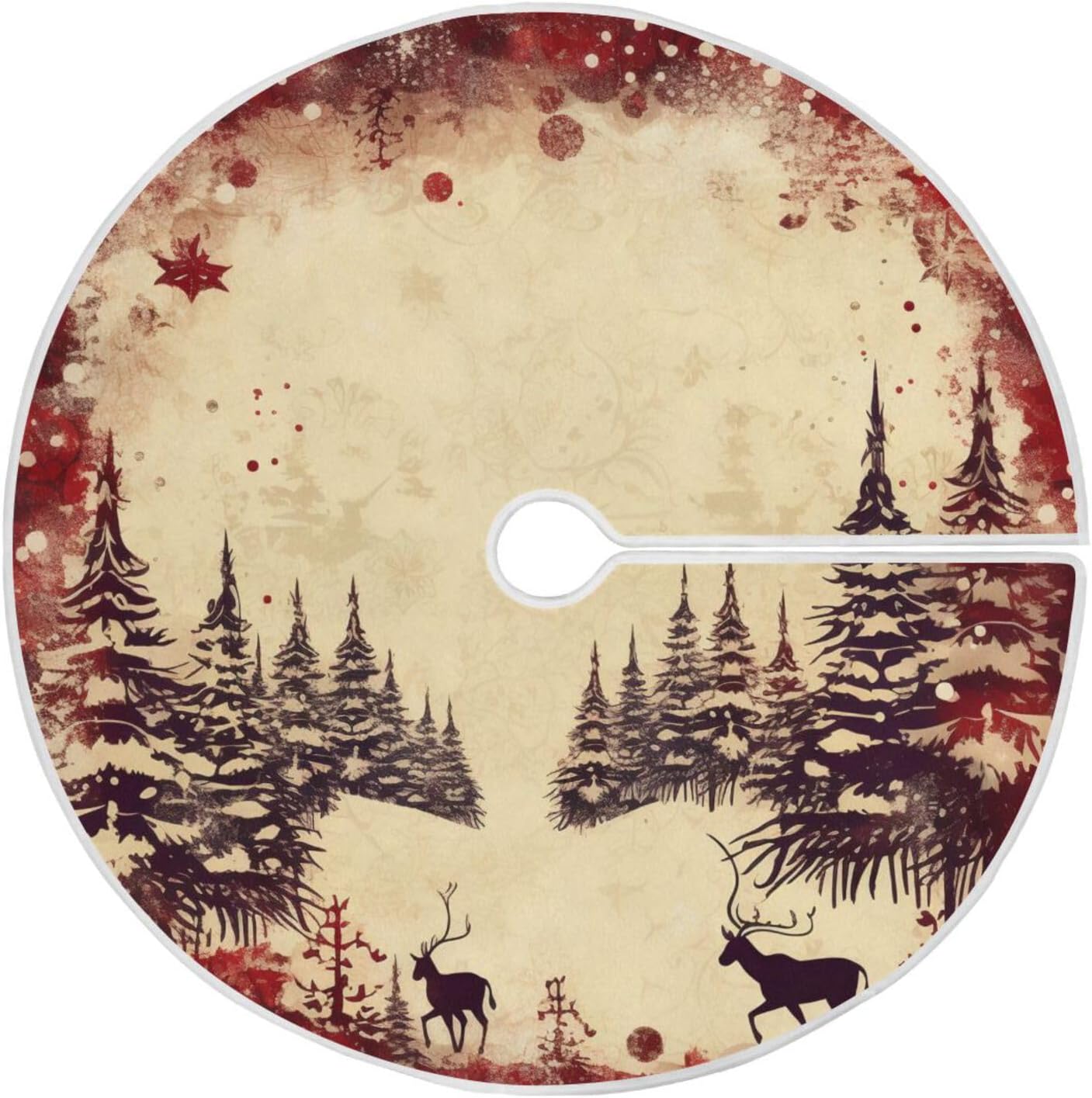 Vintage Red Elk Christmas Tree Skirt - 36 Inch Xmas Tree Mat for New Year Party Decorations