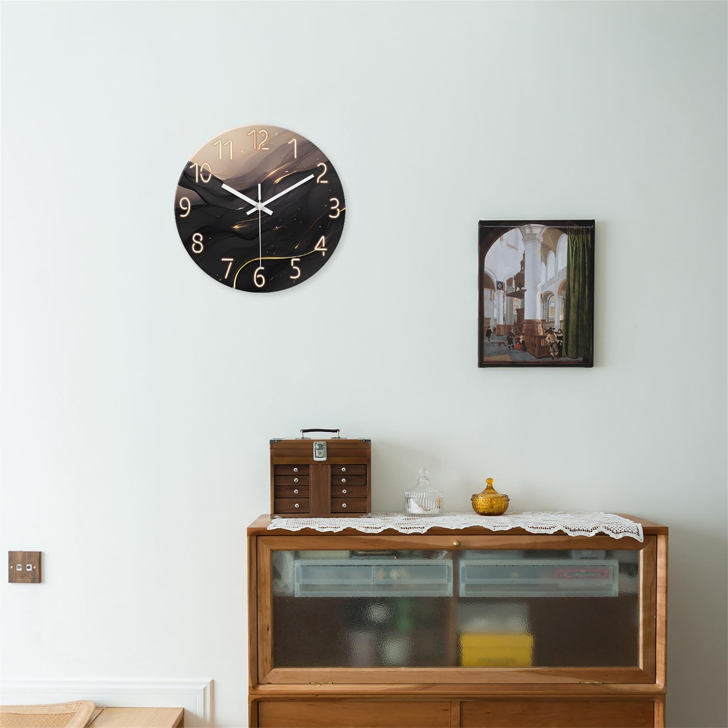 - 5.[Beautiful Decoration] - The hanging clock keeps time accurately and stylishly, suitable for living rooms, bedrooms, kitchens, bathrooms, classrooms, guest rooms, offices, restaurants, cafes, dining room, libraries, or walls of any color.