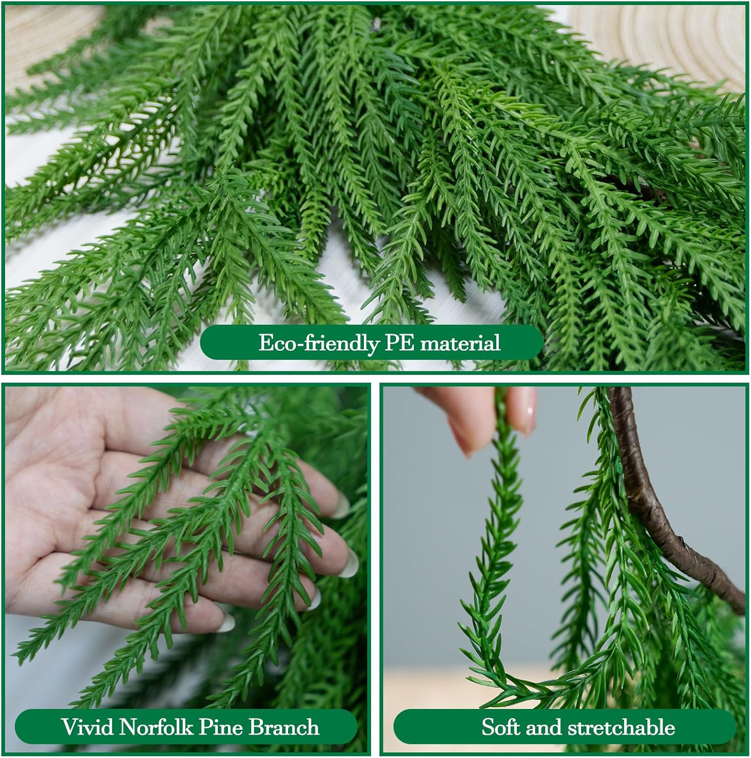 - 【Quality Material】Our Norfolk pine garland is crafted with the quality PE material; these christmas pine garland boast a robust and waterproof build, resisting fading and breakage. Bend and shape them to your will, offers a realistic design that mimics the beautiful and natural charm of real Norfolk pine, enabling a fresh and vibrant touch to your space
