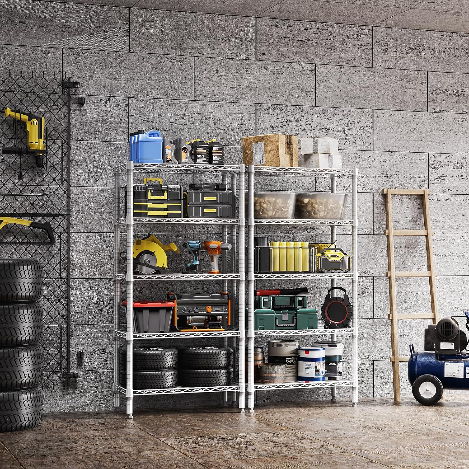 - VERSATILE DESIGN: The shelving units offer incredible versatility. It is suitable for use in a garage, balcony, pantry, and kitchen. Its special coating ensures water resistance, making it accommodated for humid environments like bathrooms