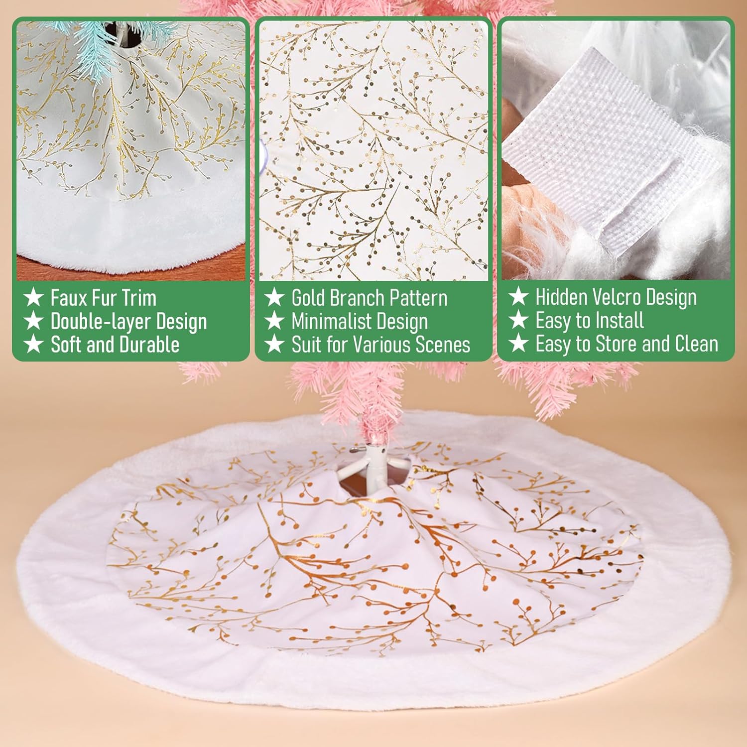 - πΌπππππ & πͺππππππ π«πππππ: This shining champagne golden Xmas tree skirt designed with gold plum blossom branches pattern, which makes Christmas tree skirts unique and gorgeous. Snowy white and Luxury gold texture make your Christmas tree more attractive and outstanding.