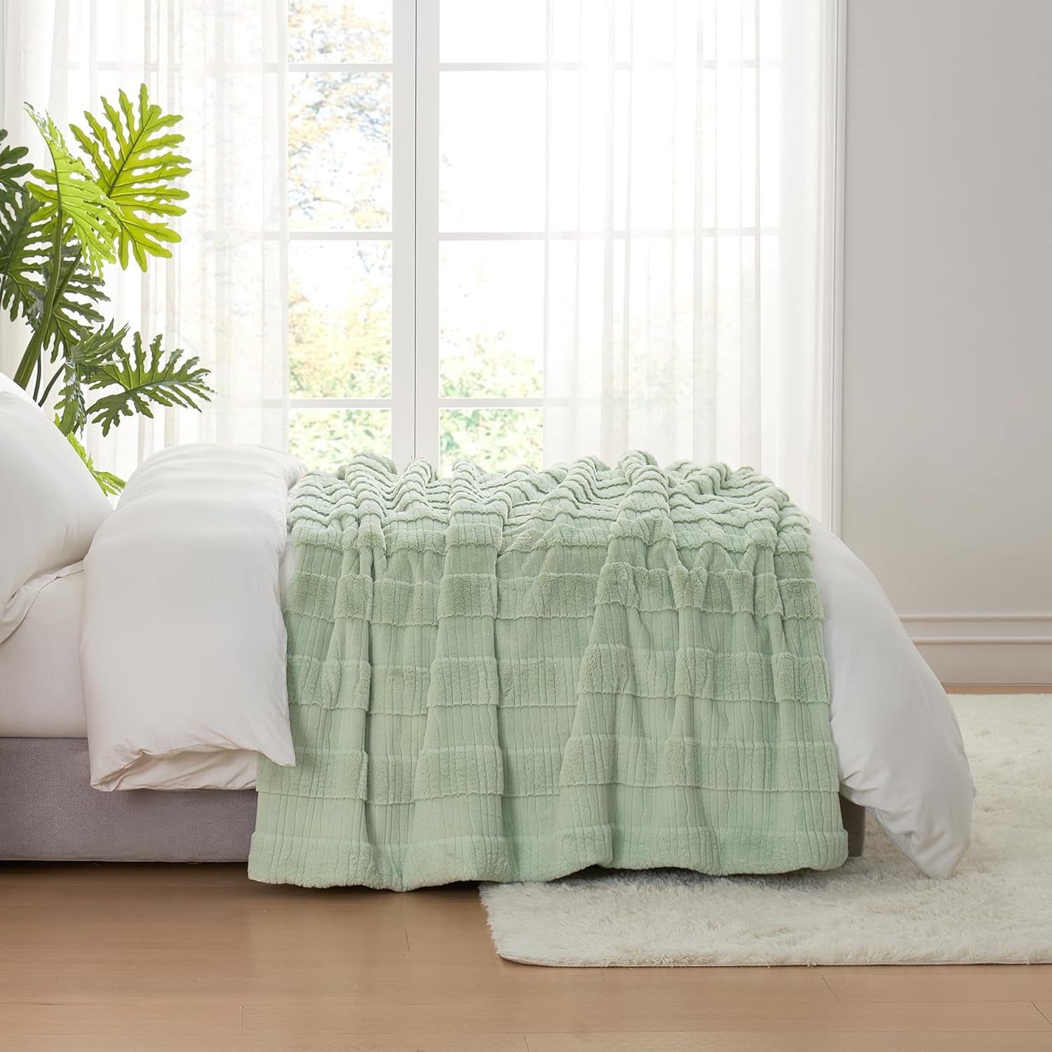 Amélie Home Luxury Striped Faux Fur Throw Blanket for Couch, Embossed Split Fur Cozy Fuzzy Fluffy Luxurious Soft Plush Sofa Chair Bed Gift Blankets for Women Men Wife Friend, 55"x70", Sage Green