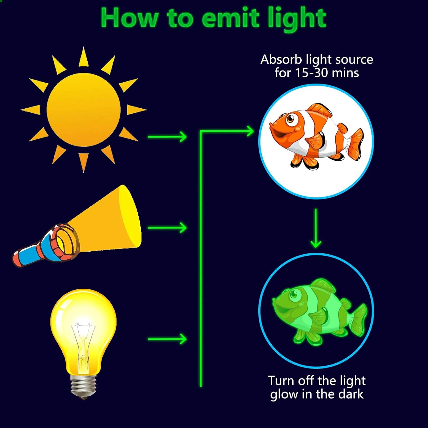 - ✦ Glow Under the Sea Wall Decals: These glow wall decals for ceiling are made of quality luminous material,they will glow brightly when absorb enough light during the day. You just need to put it under lamplight flashlight ,room light or sunshine for 15 minutes, it will keep glowing for 8-10 hours with a gentle green fluorescent light. Please ensure the light shines on the decals without obstruction, the longer it takes to absorb light, then to light up for up to longer.
