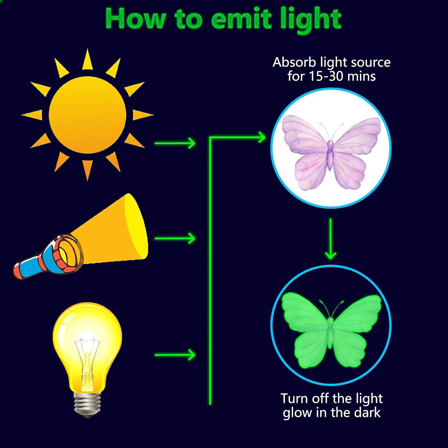 - ✦ Glow Butterfly Wall Decals: These glow wall decals for ceiling are made of quality luminous material,they will glow brightly when absorb enough light during the day. You just need to put it under lamplight flashlight ,room light or sunshine for 15 minutes, it will keep glowing for 8-10 hours with a gentle green fluorescent light. Please ensure the light shines on the decals without obstruction, the longer it takes to absorb light, then to light up for up to longer.