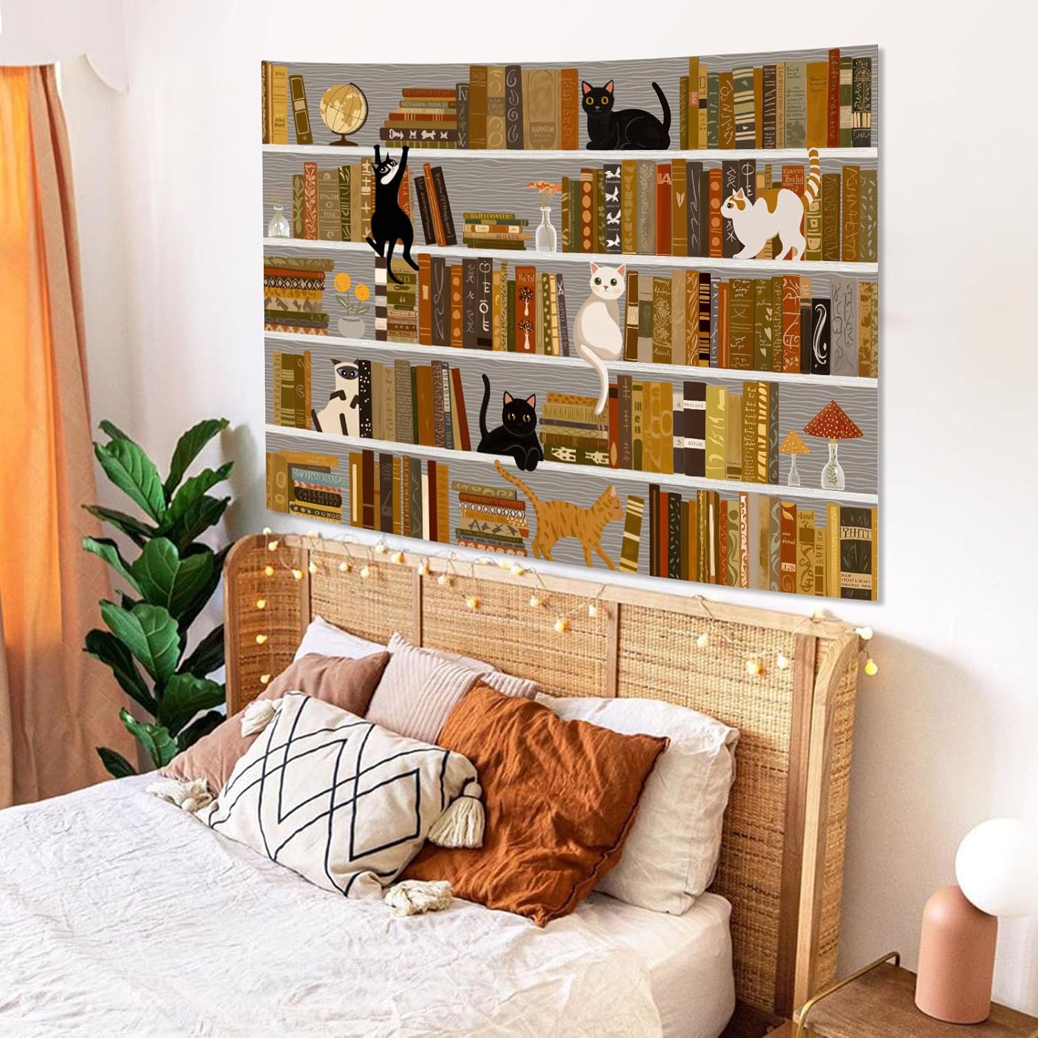 - High-Quality Material: Made from premium polyester fabric, this bookshelf cat tapestry is soft, durable, and easy to maintain. It can withstand daily use and retain its vibrant colors for a long time