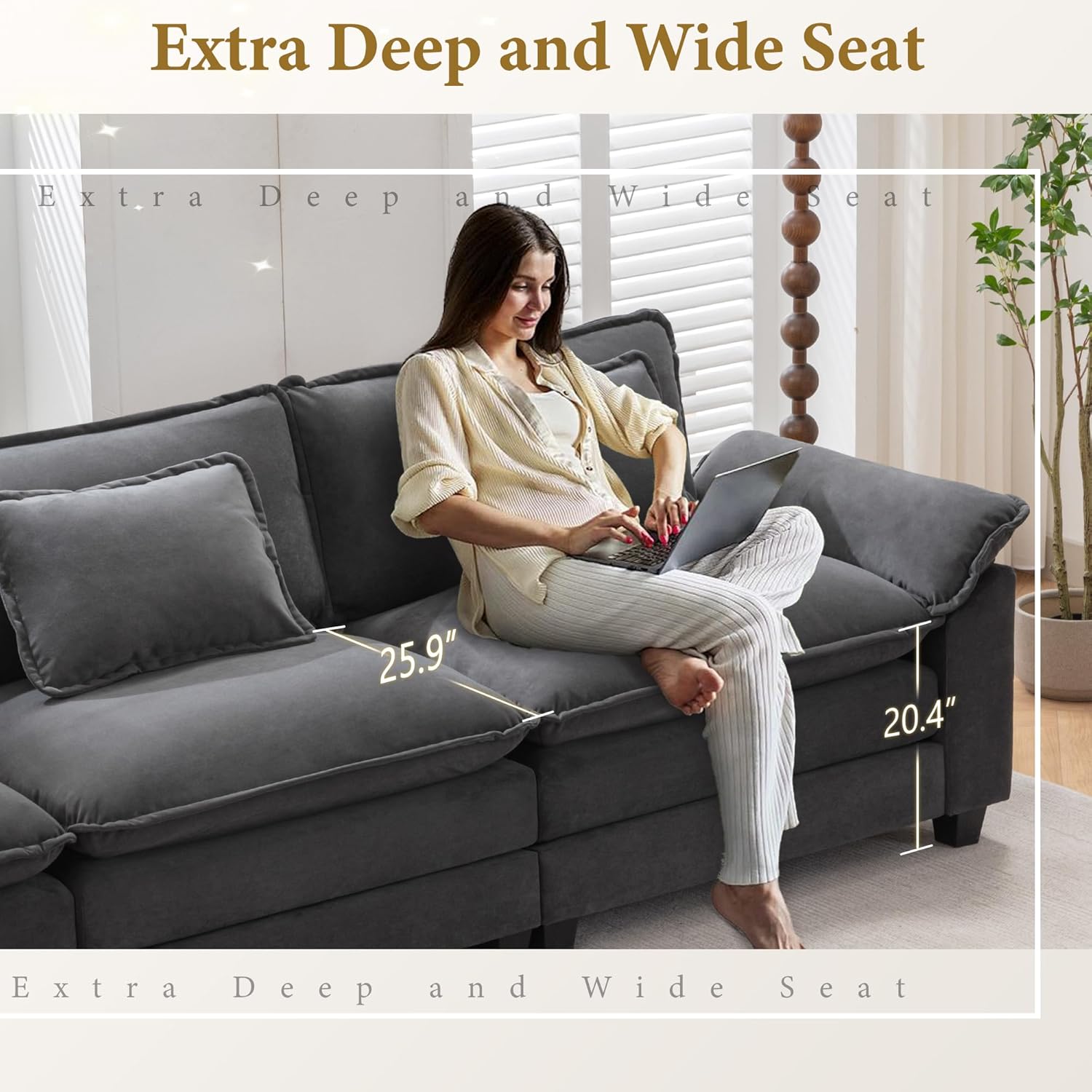 URRED Modular Sectional Sofa Comfy Cloud Couch, Modern Velvet Sofa Sleeper Deep Seat Couches with Ottoman/Pillows for Living Room (Dark Gray, 82.6'')