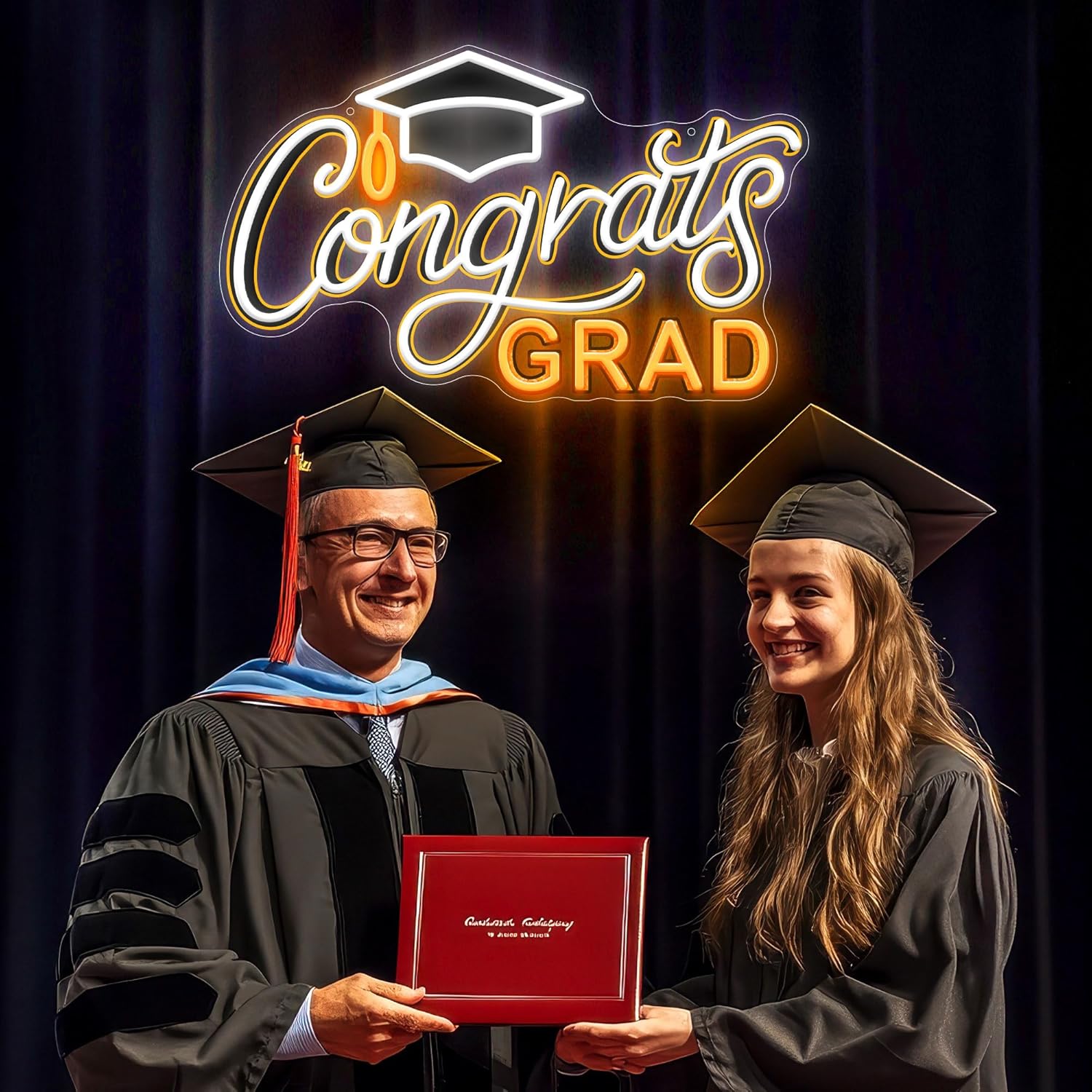 - The stylish "CONGRATS GRAD" font adds a modern touch suitable for various celebrations like graduations and birthday parties. Easy Installation & Portable Use - Equipped with hanging strings and screws, this neon sign can be easily mounted on walls or fixed on wall.