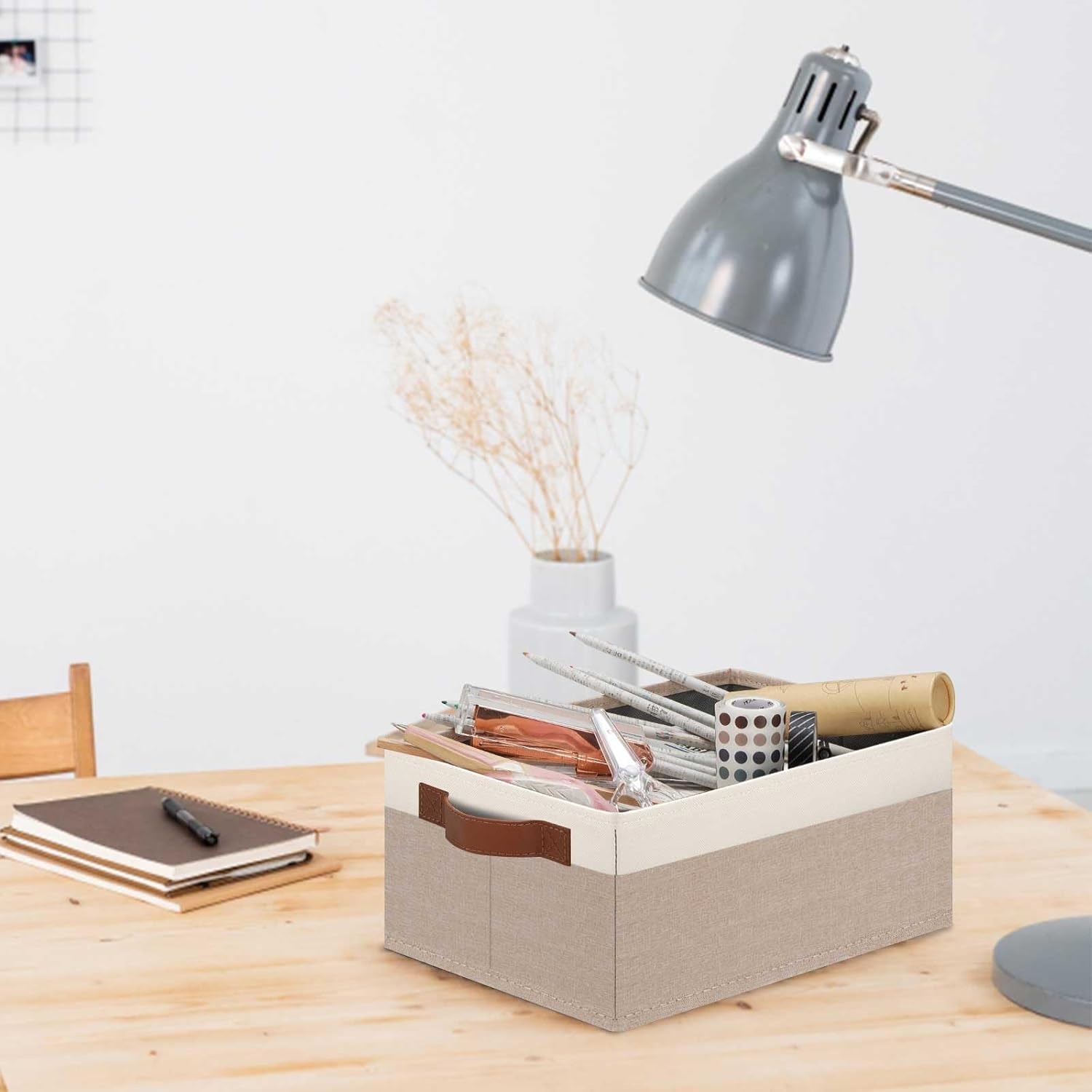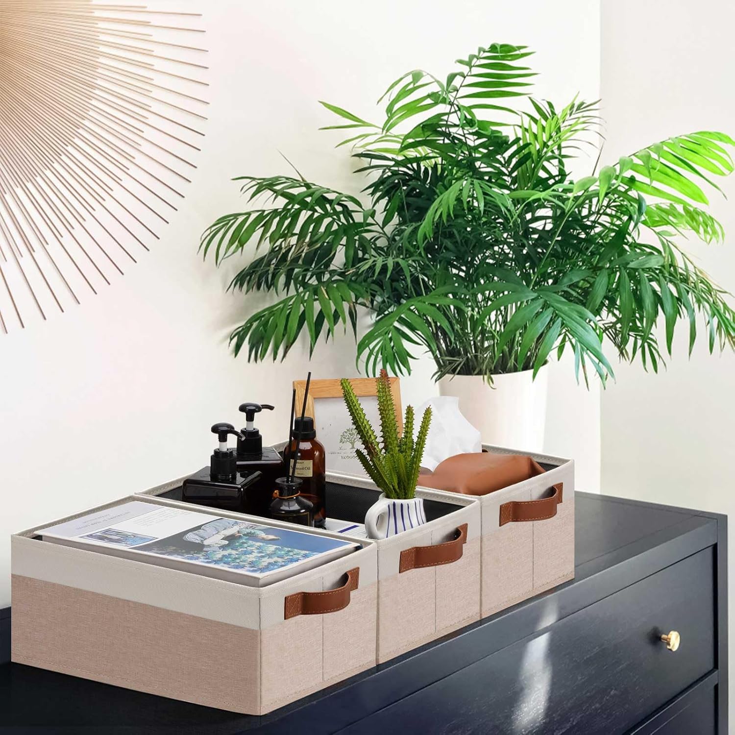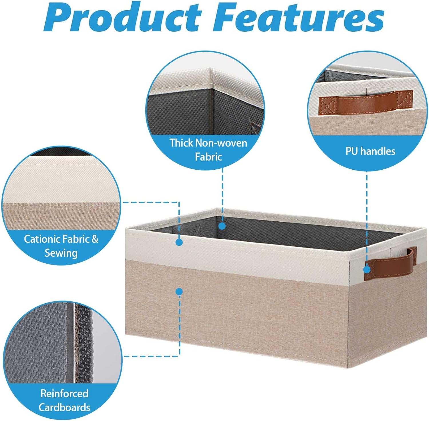 - 👍【QUALITY MATERIAL】Storage baskets for shelves are made of high-quality cationic fabric and polyester cotton fabric, and the inner layer is made of non-woven fabric, which is odorless, long-lasting and strong. Classic faux leather handles that adds a comfortable touch and provides a strong and comfort grip to pull and move. Fabric storage bin is easy to clean, just wipe with a damp sponge or cloth